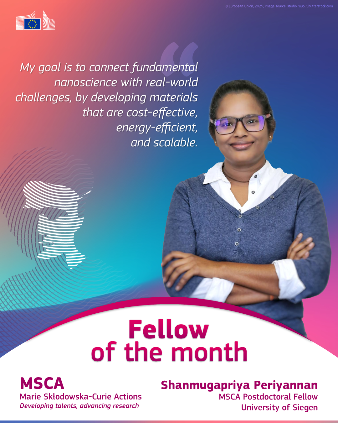 Cutting-edge research for a green future: As part of the MSCA COFUND project STAR (Sensing and Sensibility - Transcending Disciplines for a Responsible Future), Dr. Shanmugapriya Periyannan, a postdoctoral researcher at the University of Siegen, is investigating how individual atoms can use light energy to generate clean energy sources. For her innovative work, the (nano)materials scientist was awarded "Fellow of the Month" by the Marie Skłodowska-Curie Actions (MSCA) science organization in December.
