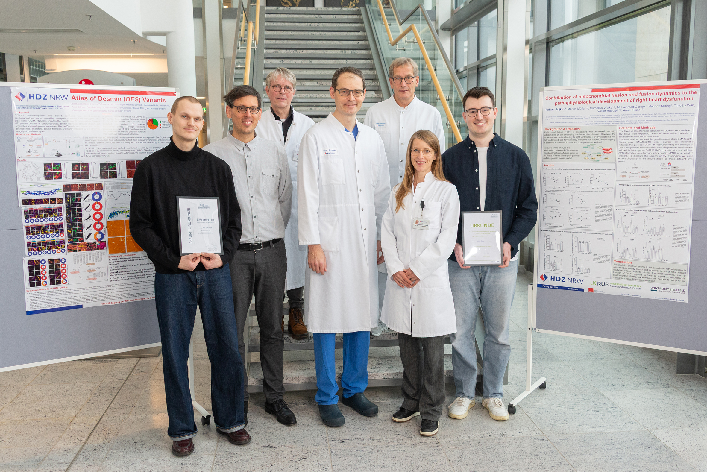 Den mit 1.000 Euro dotierten ersten Preis für die beste wissenschaftliche Präsentation erhielt Jonas Reckmann aus der Arbeitsgruppe von Prof. Dr. Hendrik Milting (Leitung) und Dr. Andreas Brodehl vom Erich und Hanna Klessmann-Institut für kardiovaskuläre Forschung und Entwicklung, das seit vielen Jahren am HDZ NRW angesiedelt ist. Im Rahmen des Fakultätstags für Promotionsstudierende wurde außerdem Fabian Bojku ausgezeichnet. Er beschäftigt sich am Agnes Wittenborg Institut für translationale Herz-Kreislaufforschung unter der Leitung von PD Dr. Anna Klinke im HDZ NRW mit der Rechtsherzschwäche.