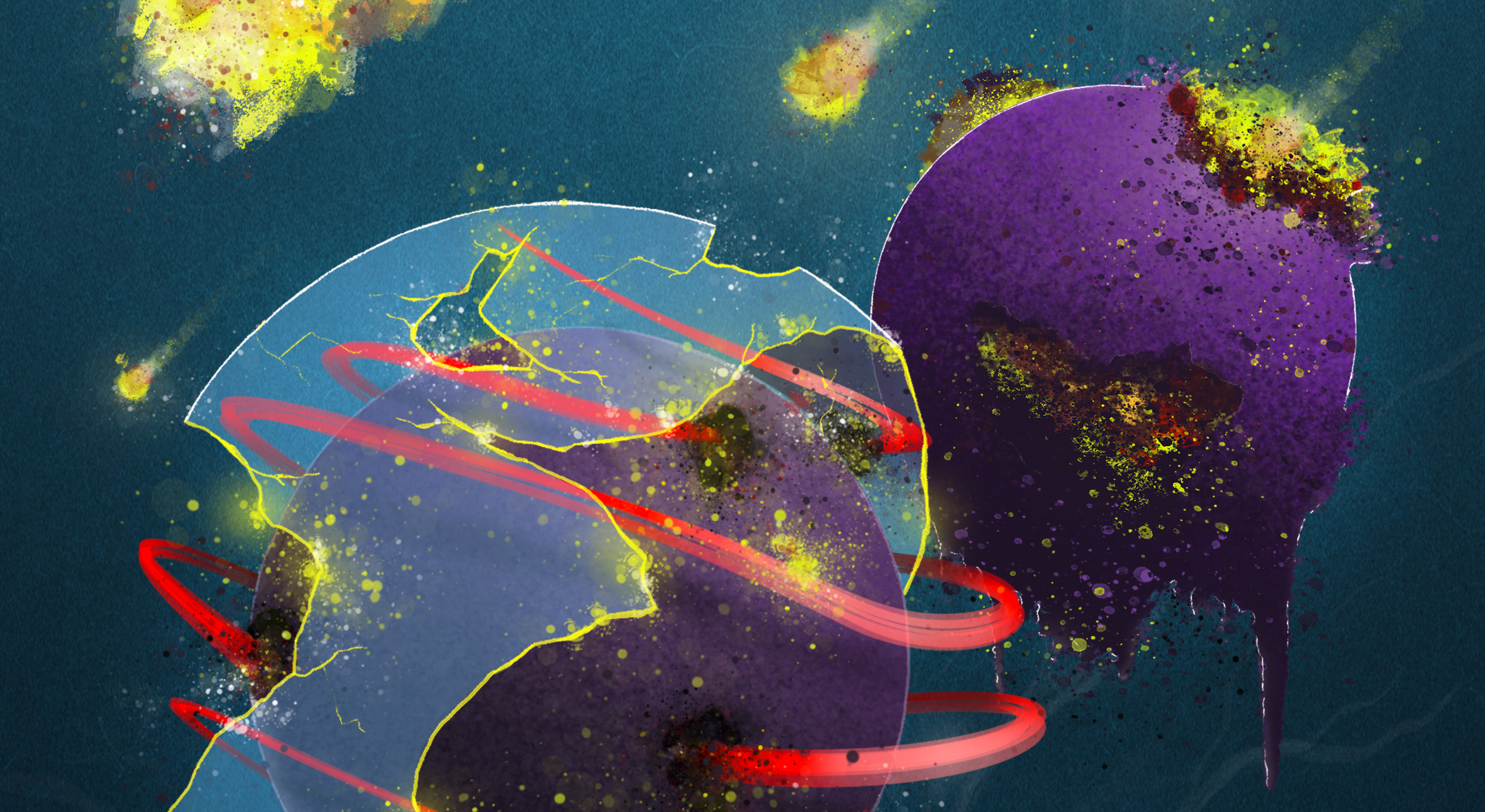 Abb.: Die stilisierte Abbildung zeigt zwei CLL-Zellen (lila Sphären), die von feuerartigen Bällen als Symbol für Eisen geschädigt werden. Die rechte Zelle zeigt eine genetische Version der Leukämiezelle, die durch die Ferroptose direkt geschädigt wird. Die linke Zelle stellt eine genetische Version dar, die durch ihre Mutation einen Schutz erhält (transparentes Schutzschild). Dieser Schutz kann durch etablierte Therapeutika brüchig werden. Um diese resistente Zelle wickeln sich zusätzlich rote Schlingen, die bestimme Fettsäuren darstellen, welche zu einer höheren Ferroptoseanfälligkeit führen.