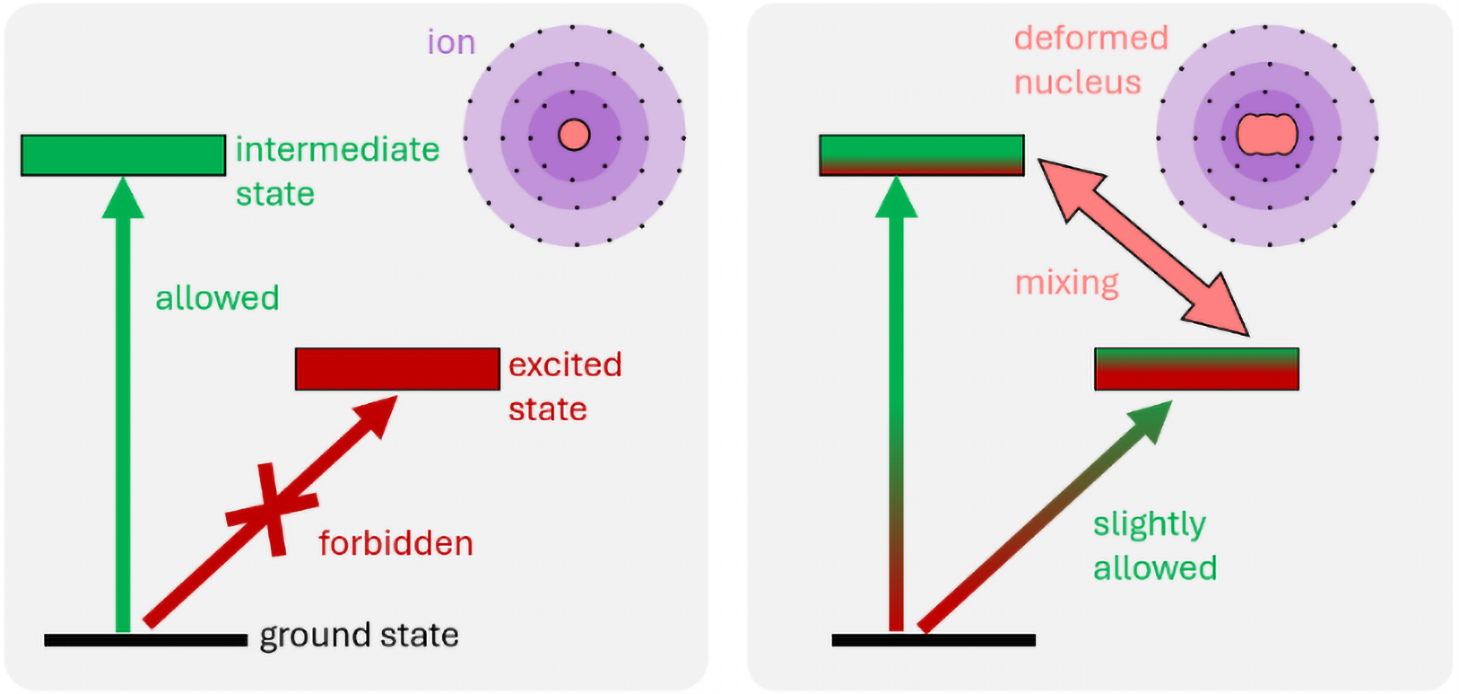 Anders als andere Atome (links) hat Ytterbium-173 (rechts) einen großen Kernspin und einen stark deformierten Kern, dessen starke Felder mit der Elektronenhülle wechselwirken. Dadurch werden verbotene Quantensprünge zu erlaubten Übergängen (siehe rotgrüner Pfeil „slightly allowed“). Damit lässt sich der Übergang leichter mit einem Laser anregen. (Abb.: PTB)