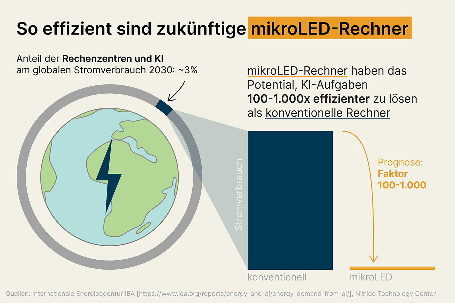 Sie wollen das Licht in die Welt der Mikroelektronik bringen: Das Land Niedersachsen und die VolkswagenStiftung fördern den niedersächsischen Mikroelektronik-Verbund „Nitride Technology Center“ (NTC) unter Federführung der Technischen Universität Braunschweig mit rund 15 Millionen Euro. Unter dem Projektnamen „Bringing Light to Micoelectronics“ (BRIGHT) entwickelt der Verbund unter anderem einen einzigartigen neuromorphen Computer auf der Basis von LEDs. Dieser soll zukünftig den gigantischen Stromverbrauch von KI-Anwendungen dramatisch reduzieren.