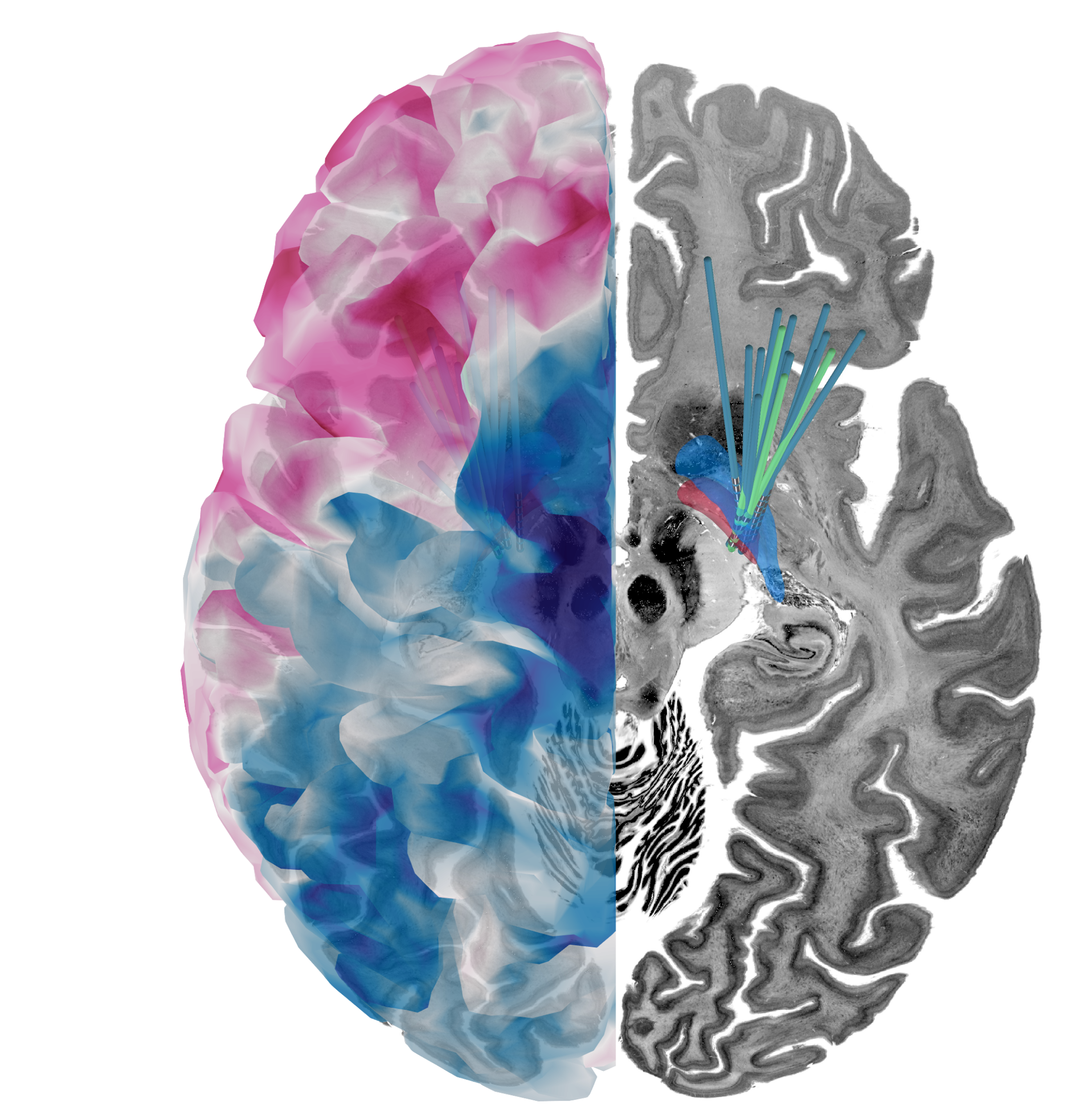 Links: Muster der niederfrequenten Hirnaktivität. Blaue Areale beschreiben eine Abnahme der Hirnaktivität nach Aktivierung der Tiefen Hirnstimulation und rote Bereiche eine Zunahme. Rechts: Lokalisation der Stimulationselektroden, die für die Tiefe Hirnstimulation bei Menschen mit zervikaler Dystonie in einem Kerngebiet in den Basalganglien implantiert werden (dem Globus pallidus internus). Im Hintergrund ist der Big Brain Atlas dargestellt (Amunts et al. 2013. Science).