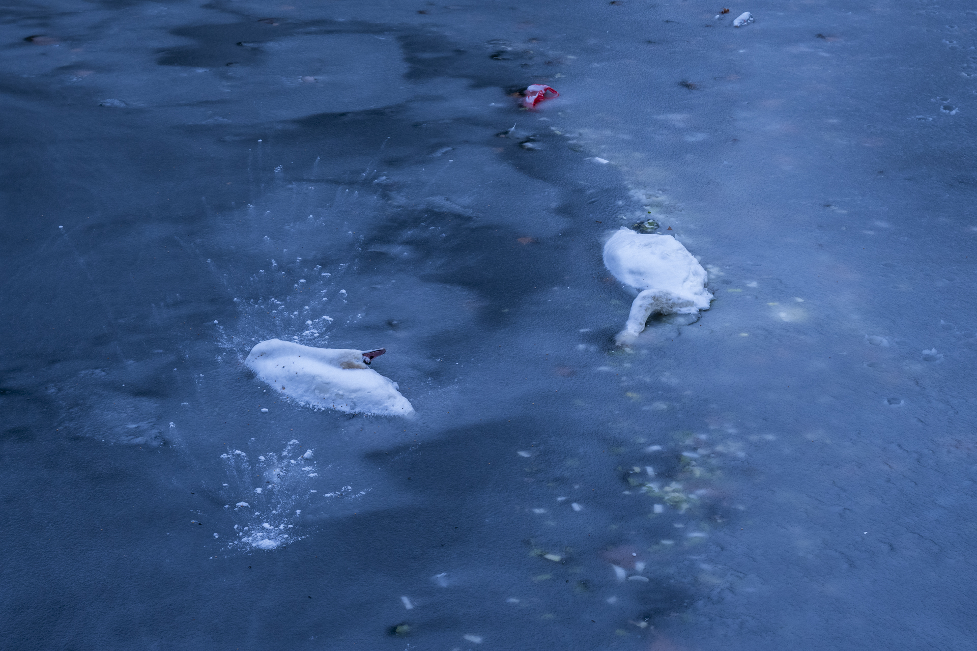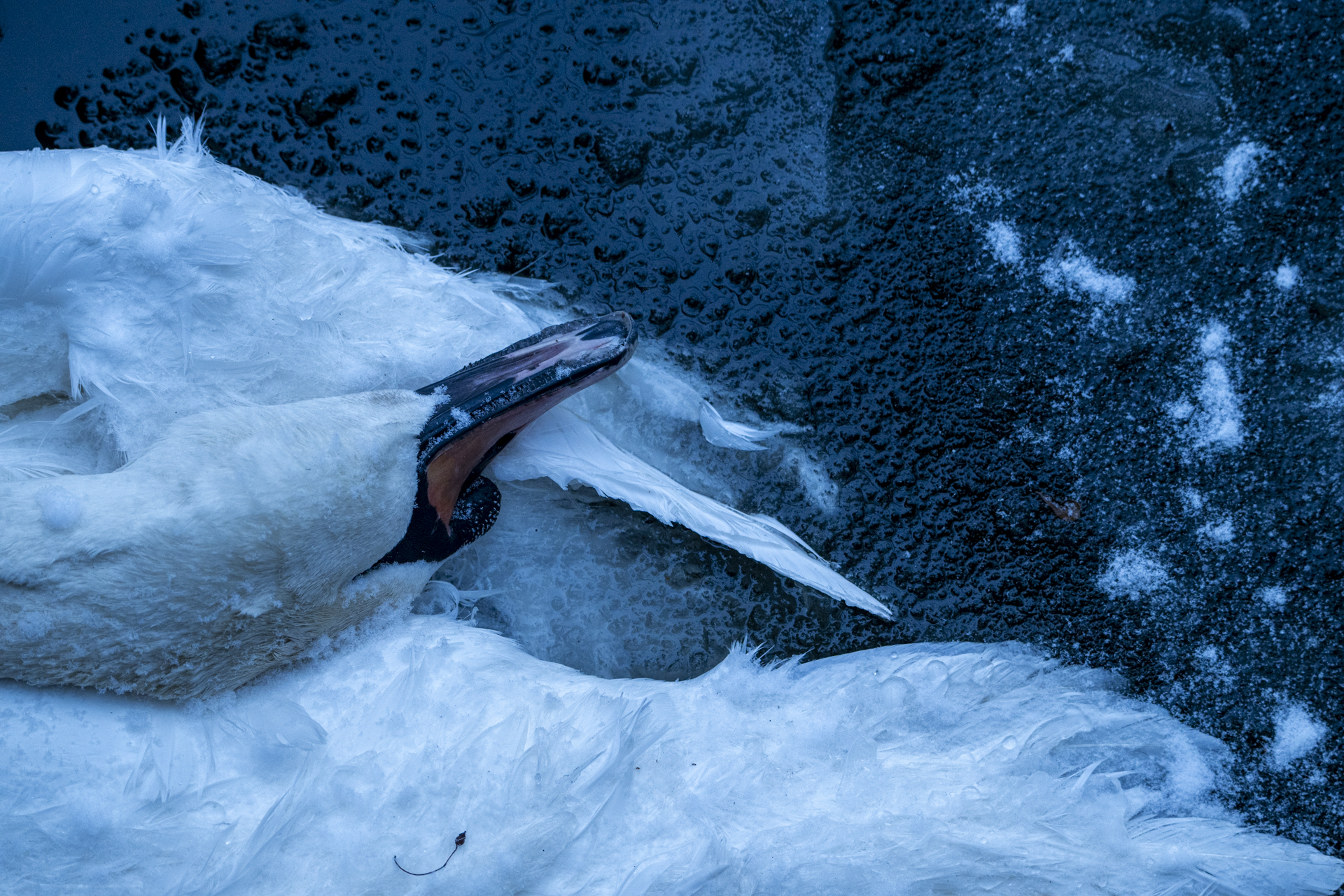 Vor allem werden derzeit viele Höckerschwäne gemeldet, die scheinbar oder auch tatsächlich im Eis festgefroren sind. Schwäne kommen in der Regel auch mit vereisten Flächen gut zurecht. Bei Kälte reagieren Wasservögel zudem mit der Absenkung ihres Stoffwechsels und verharren bewegungslos. Außerdem schafft aufgeplustertes Gefieder eine isolierende Luftschicht und die Bürzeldrüse produziert ein öliges Sekret, das die Tiere vor Kälte und dem Festfrieren schützt. Unter extremen Witterungen können jedoch kranke, verletzte und immobile Wasservögel im Eis einfrieren. Von eigenständigen Rettungsversuchen wird in allen Fällen unbedingt abgeraten, denn sie gefährden die Helfenden und können auch die Tiere stark stressen. Die Eisdecke ist nicht stabil, so dass die Bergung von sterbenden und toten Schwänen auf dem Eis selbst für die Wasserpolizei und Feuerwehr schwierig und gefährlich ist. Die Feuerwehr ist aufgrund der akuten Wetterlage mit anderen Einsätzen ausgelastet und kann sich nicht um möglicherweise festgefrorene Wasservögel kümmern.