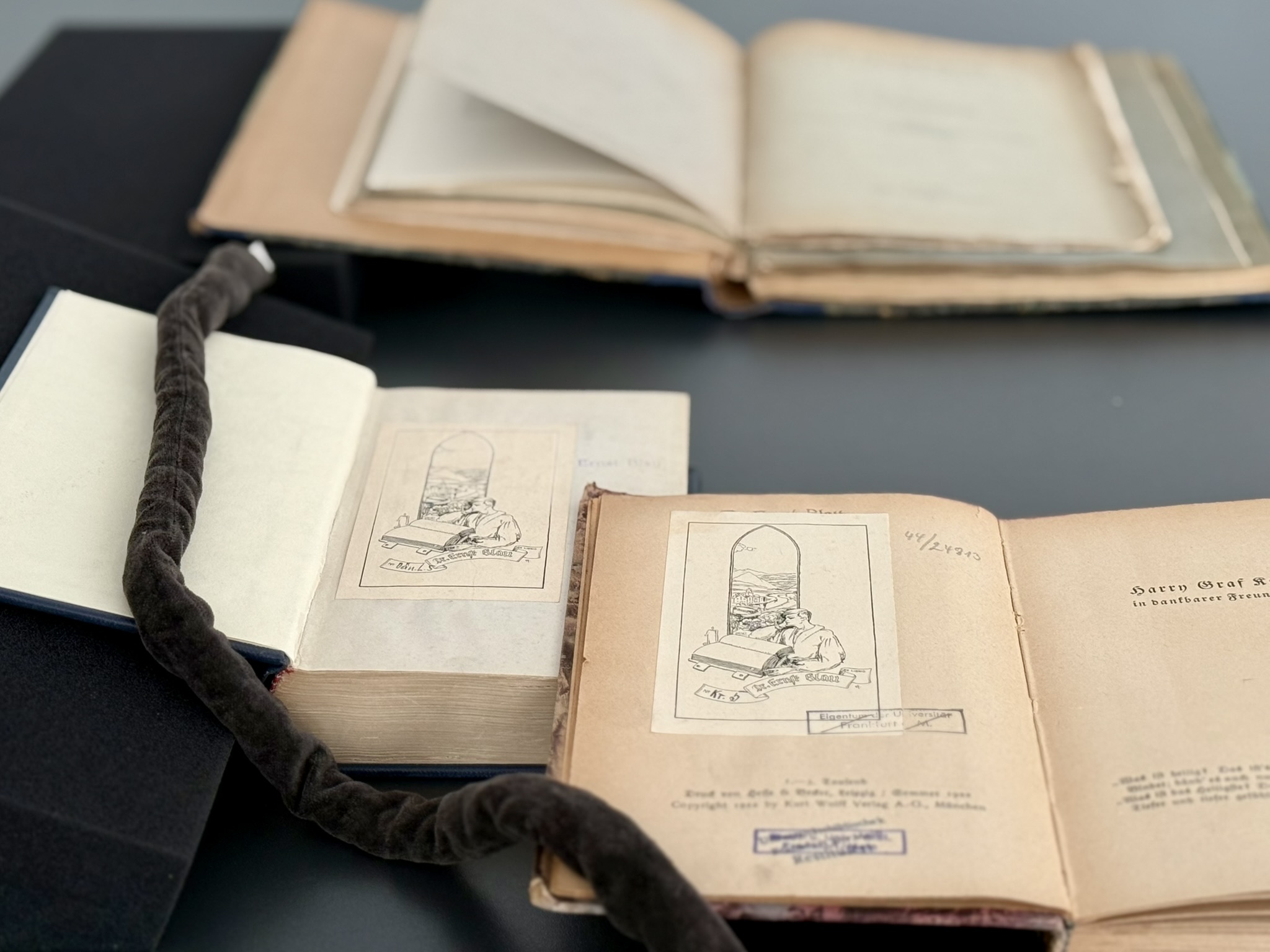 In numerical terms, it was a comparatively small restitution: five volumes were handed over within the premises of the University Library (UB). What made the occasion exceptional was that this marked the first time the UB returned books to Frankfurt’s Jewish Community. Among them were volumes previously owned by individuals of central importance to the predecessor community. Julius Blau (*1861), an attorney and notary, served as chair of the Israelite Community from 1903 until his death in 1939 and was actively involved in numerous Jewish aid organizations. His term of office included milestones such as the construction of the Westend Synagogue (1910) and the Philanthropin – the city’s historic Jewish school – on Hebelstraße (1908), but also the early years of the Nazi era. His son Ernst (*1892) worked as a librarian for the Israelite Community, emigrated to France in 1939, and died in 1941 at the Gurs concentration camp. Two additional books originated from the community library itself or from the “Tagesheim der erwerbslosen jüdischen Jugend” [Day Home for Unemployed Jewish Youth].