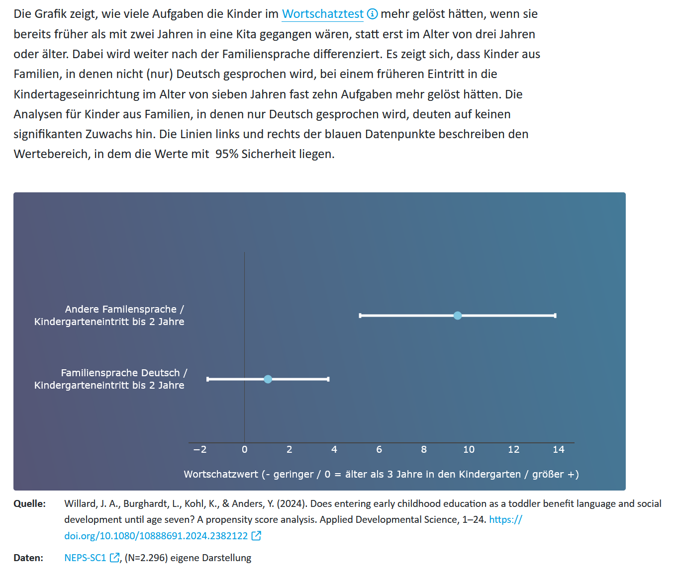 Willard, J. A., Burghardt, L., Kohl, K., & Anders, Y. (2026). Does entering early childhood education as a toddler benefit language and social development until age seven? A propensity score analysis. Applied Developmental Science, 30(1), 88–111. https://doi.org/10.1080/10888691.2024.2382122