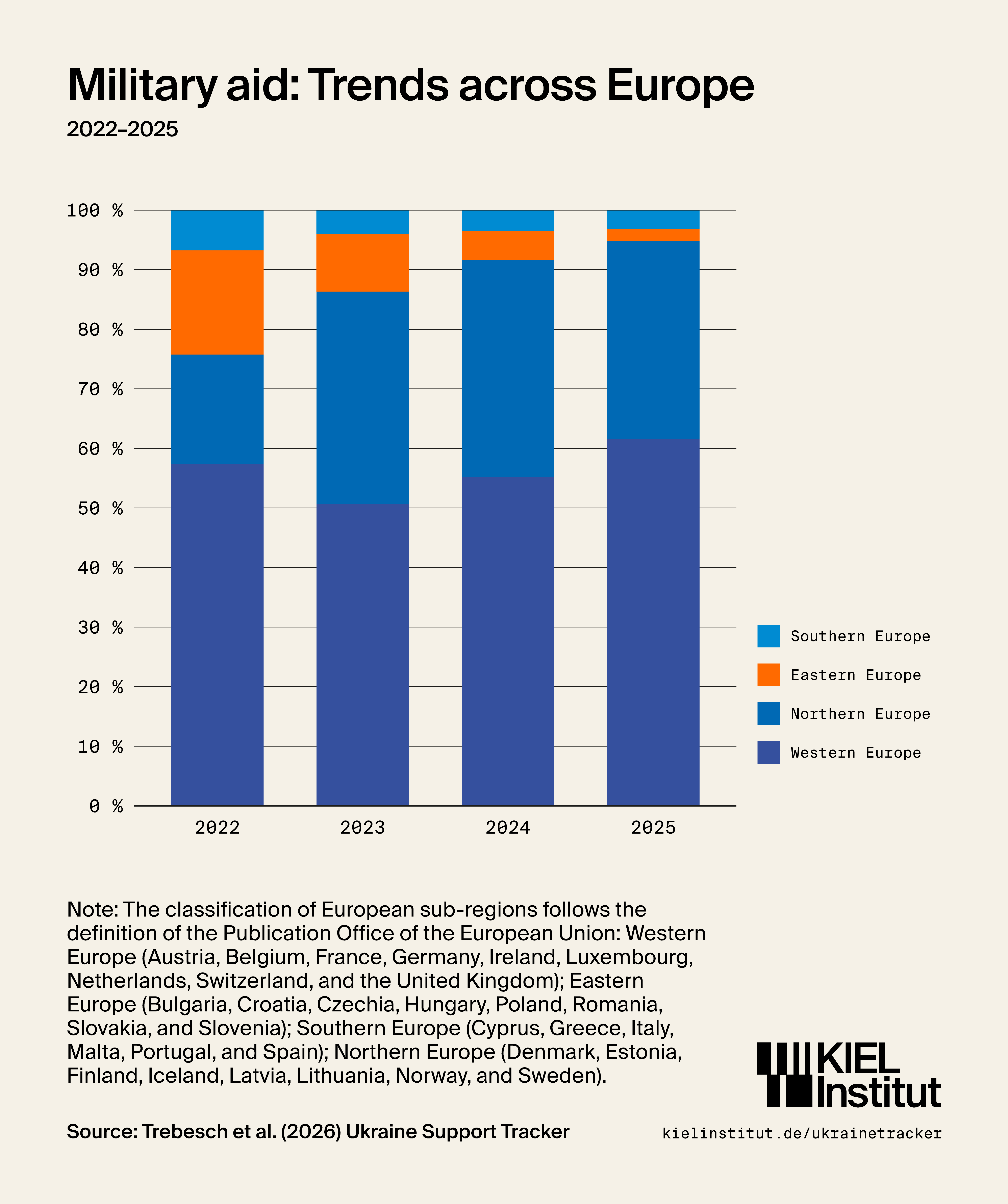 “The increase in European military aid in 2025 shows growing disparities, with a few countries doing ever more,” Trebesch adds. “In 2025, Northern Europe provided around one third of Europe’s military aid despite accounting for only 8 percent of GDP among the 31 European donors covered in the Tracker, Western Europe contributed roughly in line with its economic size, while Southern Europe remains a small donor despite representing 19 percent of GDP.”