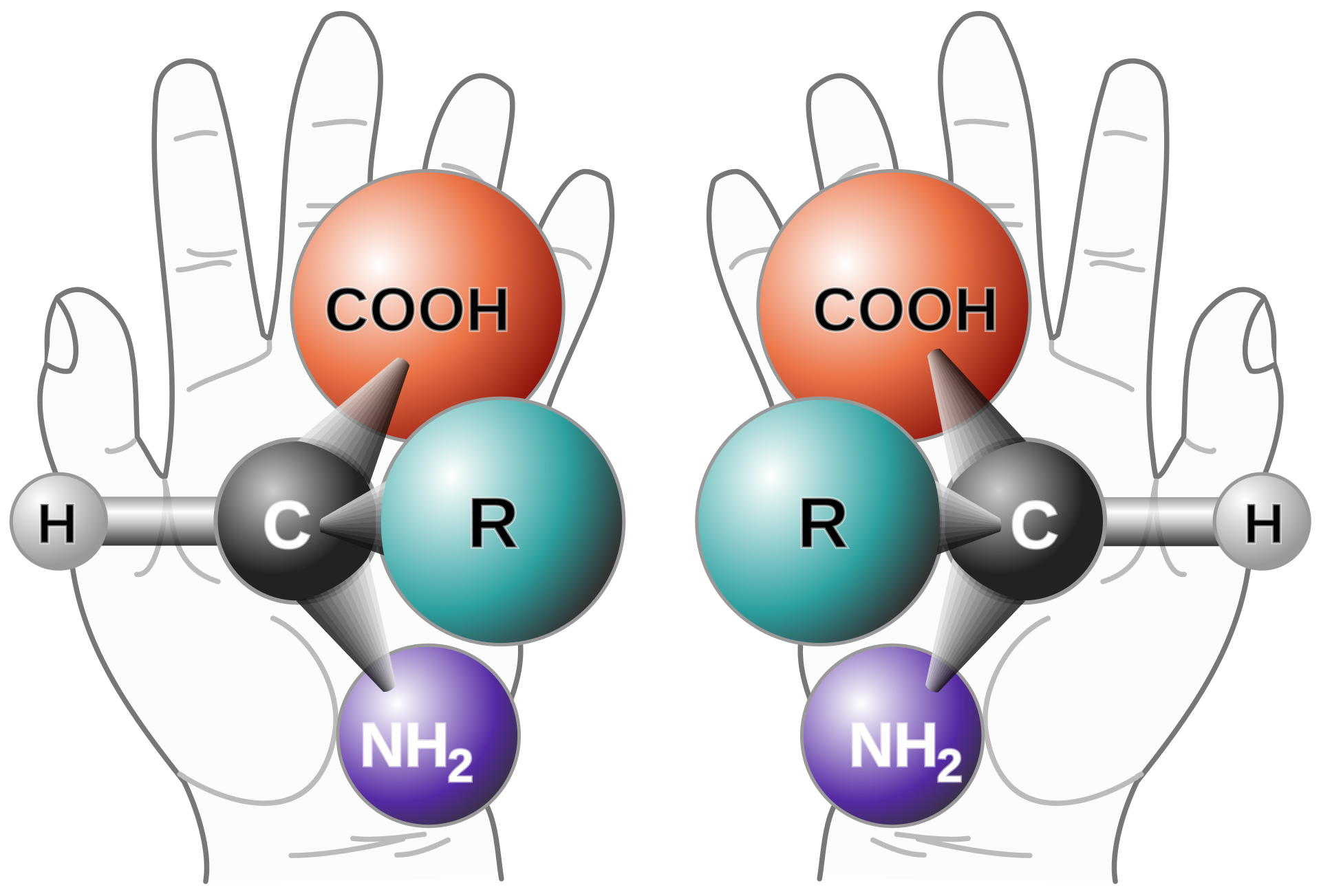 Stärke und Ausrichtung der magnetischen Effekte hängen ganz entscheidend von der Struktur der (Bio)Moleküle ab, über die der Elektronentransport abgewickelt wird. An dieser Stelle kommt die sogenannte Chiralität ins Spiel – auf Deutsch übersetzt mit „Händigkeit“. Gemeint ist damit ein strukturelles Phänomen aus der Chemie und Molekularbiologie, das sich auf den räumlichen Aufbau beziehungsweise auf die Drehrichtung der Moleküle bezieht. Chirale Moleküle gibt es wie die linke und die rechte Hand des Menschen in zwei spiegelbildlichen Formen. Während Aminosäuren im Organismus fast ausschließlich „linkshändig“ beziehungsweise „linksdrehend“ als L-Aminosäuren vorkommen, sind Zuckermoleküle in der Regel „rechtshändig“. Für die Aktivität von Enzymen ist dieser strukturelle Unterschied in der räumlichen Ausrichtung entscheidend.