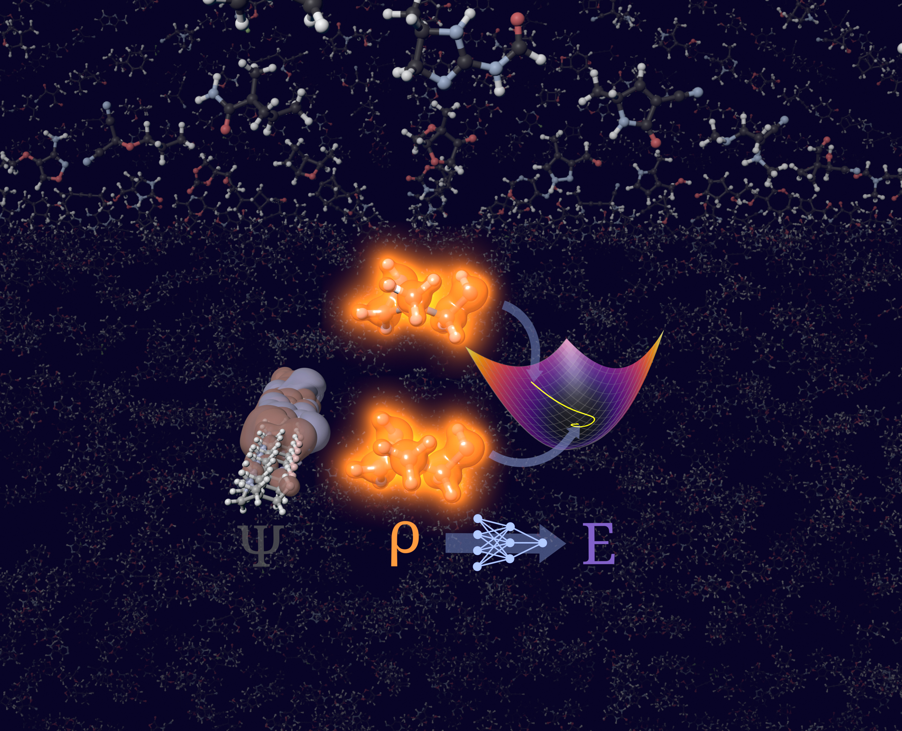 Can quantum chemistry function without orbitals? In fact, machine learning has, for the first time, enabled a stable convergence of orbital-free density functional theory, thereby opening up the potential for considerably faster predictions with high accuracy. The figure schematically illustrates the transition from a wave function-based description (ψ) to an orbital-free representation in which the energy (E) is calculated from the electron density (ρ). All graphical elements – except for the arrows and pictogram – are based on actual computational results.
