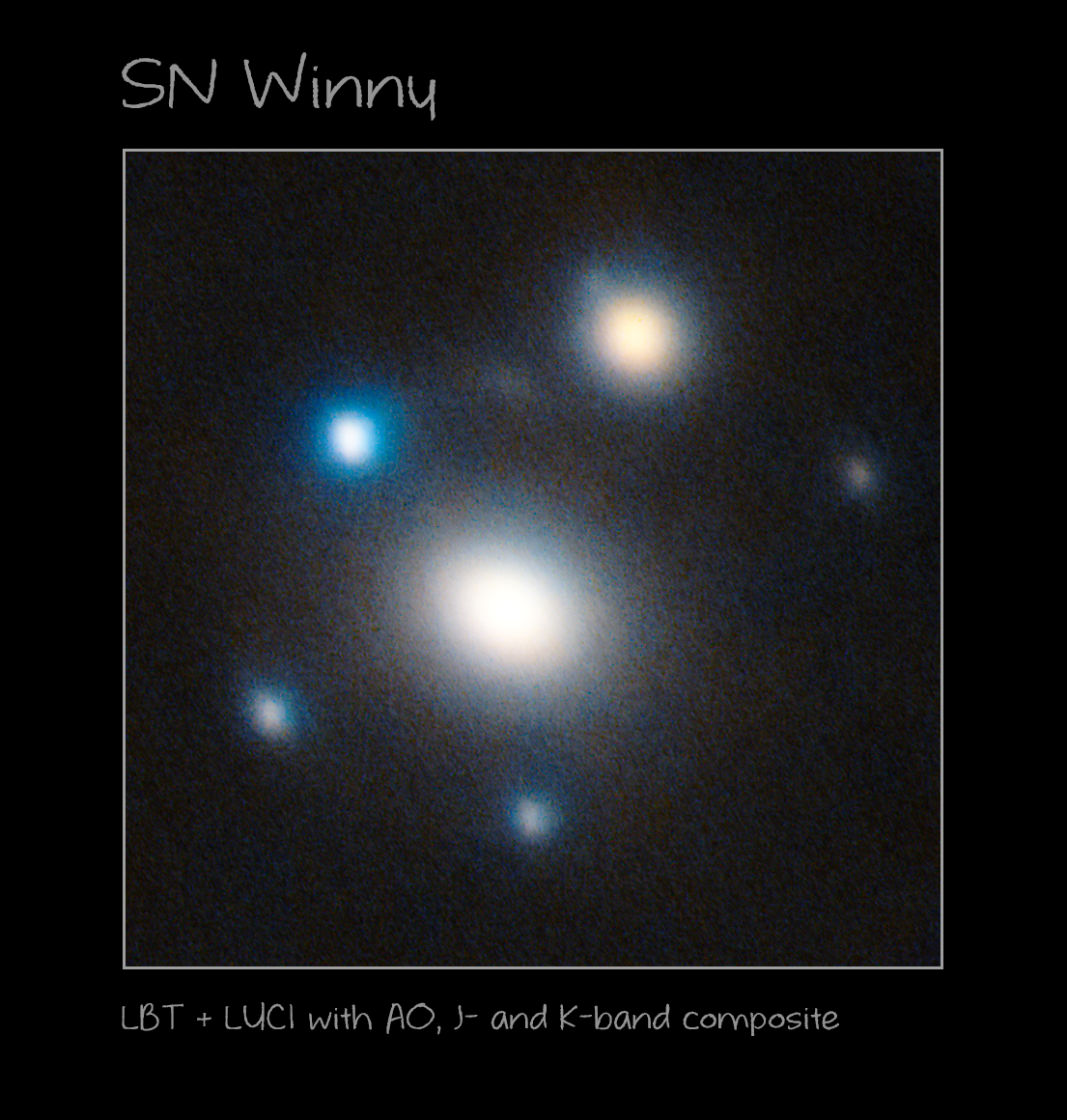 Supernovae hinter Gravitationslinsen sind so selten, dass bislang nur wenige solcher Messungen versucht wurden. Ihre Genauigkeit hängt stark davon ab, wie gut man die Massen der Galaxien bestimmen kann, die als Linse wirken, denn diese entscheiden darüber, wie stark das Licht der Supernova abgelenkt wird. Um die Massen zu messen, nutzten Team-Mitglieder vom MPE und der LMU das Large Binocular Telescope in Arizona mit seinen zwei Spiegeln von je 8,4 Metern Durchmesser und einem adaptiven Optiksystem, das atmosphärische Unschärfen korrigiert. Das Ergebnis ist das einzige bislang veröffentlichte hochauflösende Farbbild dieses Systems.