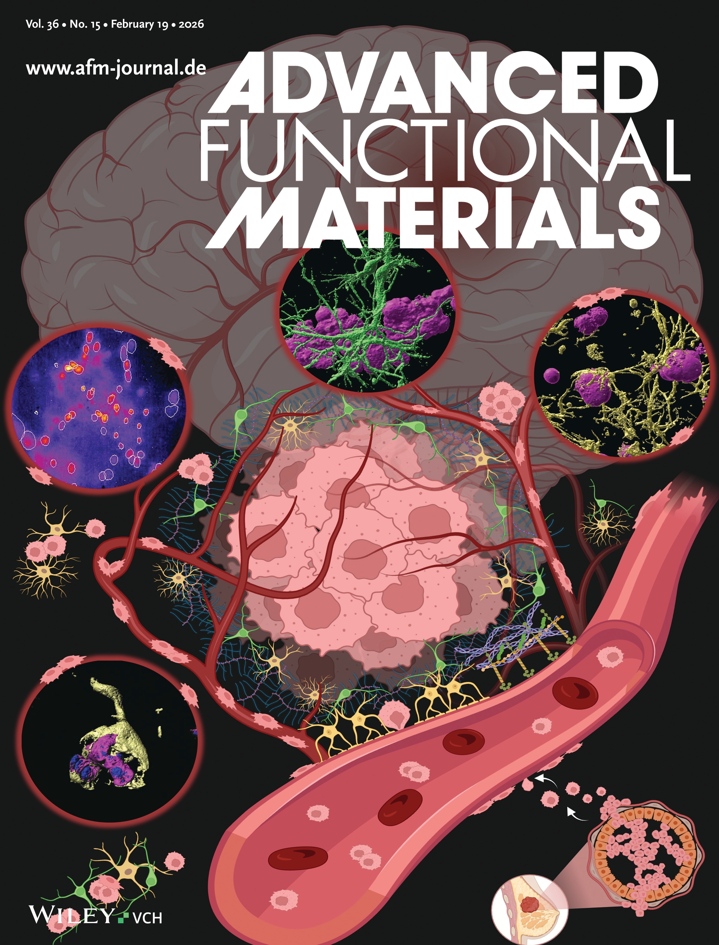 Die AG Villmann lieferte das Bild für die Rückseite des Einbandes der Fachzeitschrift Advanced Functional Materials. Zu sehen sind in das Gehirn metastasierte Brustkrebszellen (Kreis und Vergrößerung unten rechts). Sie stehen eng mit den Blutgefäßen in Kontakt, da sie über diese Nährstoffe und Sauerstoff enthalten und die Gefäße als Steuerungs- und Orientierungshilfe dienen. Die Tumorzellen passen sich schließlich immer mehr der neuen Umgebung im Gehirn an und gehen eine enge Wechselwirkung mit den Proteinen der extrazellulären Matrix des Gehirns ein (roter Kreis unten links), interagieren über pseudosynaptische Kontakte mit Neuronen sowie über Gap Junctions mit Astrozyten (Kreise oben rechts). Die Erregungsaktivität der Neuronen ist in Anwesenheit von Tumorzellen erhöht (Kreis oben links). Nach einer gewissen Zeit beginnen sie sich zu vermehren und bilden kleine Tumorkolonien. © Türker et al. AFM. 2025