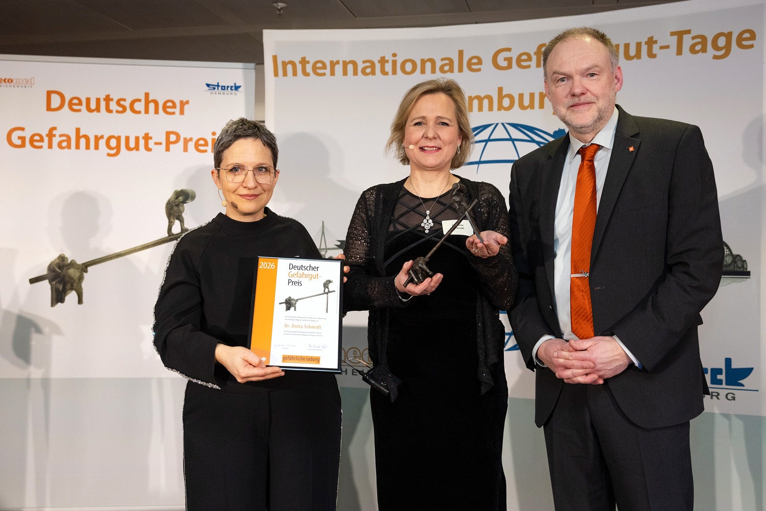 Berlin, 24.02.2026. Anita Schmidt von der Bundesanstalt für Materialforschung und -prüfung (BAM) ist mit dem Deutschen Gefahrgut-Preis 2026 ausgezeichnet worden. Die Jury würdigte insbesondere ihr „andauerndes Engagement bei der Fortentwicklung der Gefahrgutvorschriften für Verpackungen und der Sicherheit von Lithium-Batterien“. Die Ehrung fand gestern im Rahmen der 40. Internationalen Gefahrgut-Tage in Hamburg statt.