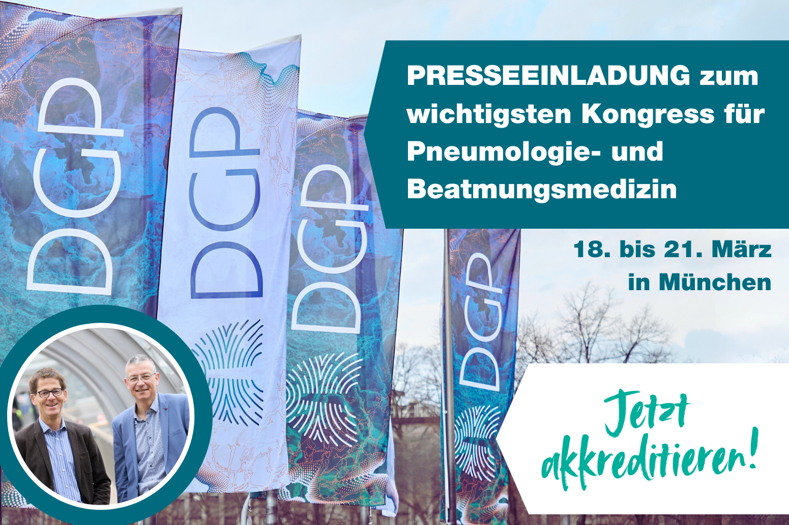 in drei Wochen geht es los – schon jetzt akkreditieren: Wir laden Sie herzlich zum Jahreskongress der Deutschen Gesellschaft für Pneumologie und Beatmungsmedizin (DGP) ein, der vom 18. bis 21. März im International Congress Center Messe München stattfindet. Erwartet werden rund 4.000 Teilnehmende, es ist der wichtigste Termin für sämtliche Berufsgruppen aus dem Bereich der Lungenheilkunde. Neben einem spannenden Präsenz-Programm wird es auch wieder einen Livestream mit ausgewählten Veranstaltungen geben.