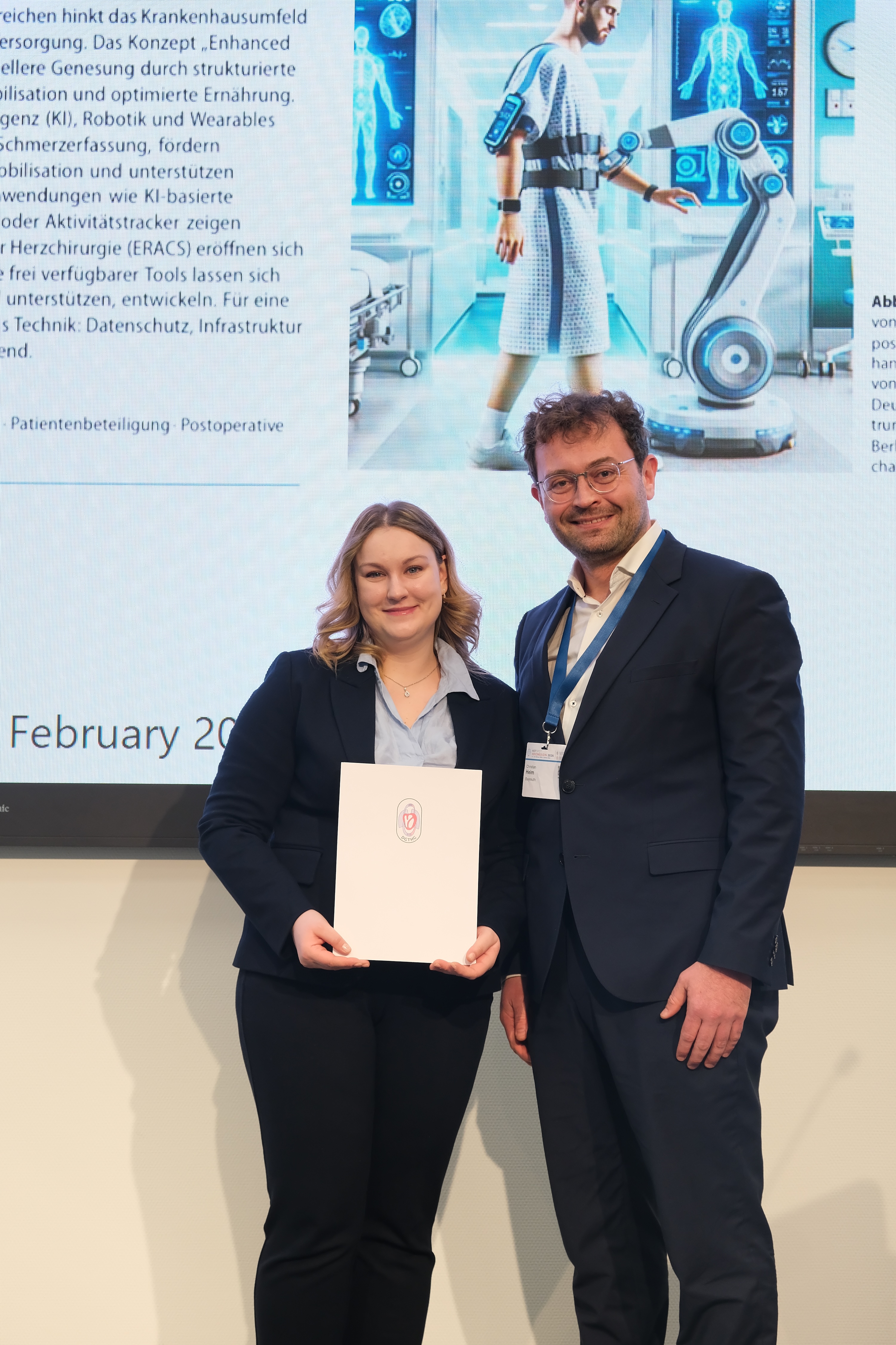 Auf ihrer Jahrestagung in Köln verlieh die Deutsche Gesellschaft für Thorax-, Herz- und Gefäßchirurgie vergangenes Wochenende gemeinsam mit dem Springer Medizin Verlag den Publikationspreis der Zeitschrift für Herz-, Thorax- und Gefäßchirurgie (ZHTG) 2026. Preisträgerin Kinga Oleksiuk von der Charité Berlin wurde für ihren Artikel über das Potenzial von Künstlicher Intelligenz bei der postoperativen Behandlung von Patient:innen ausgezeichnet.