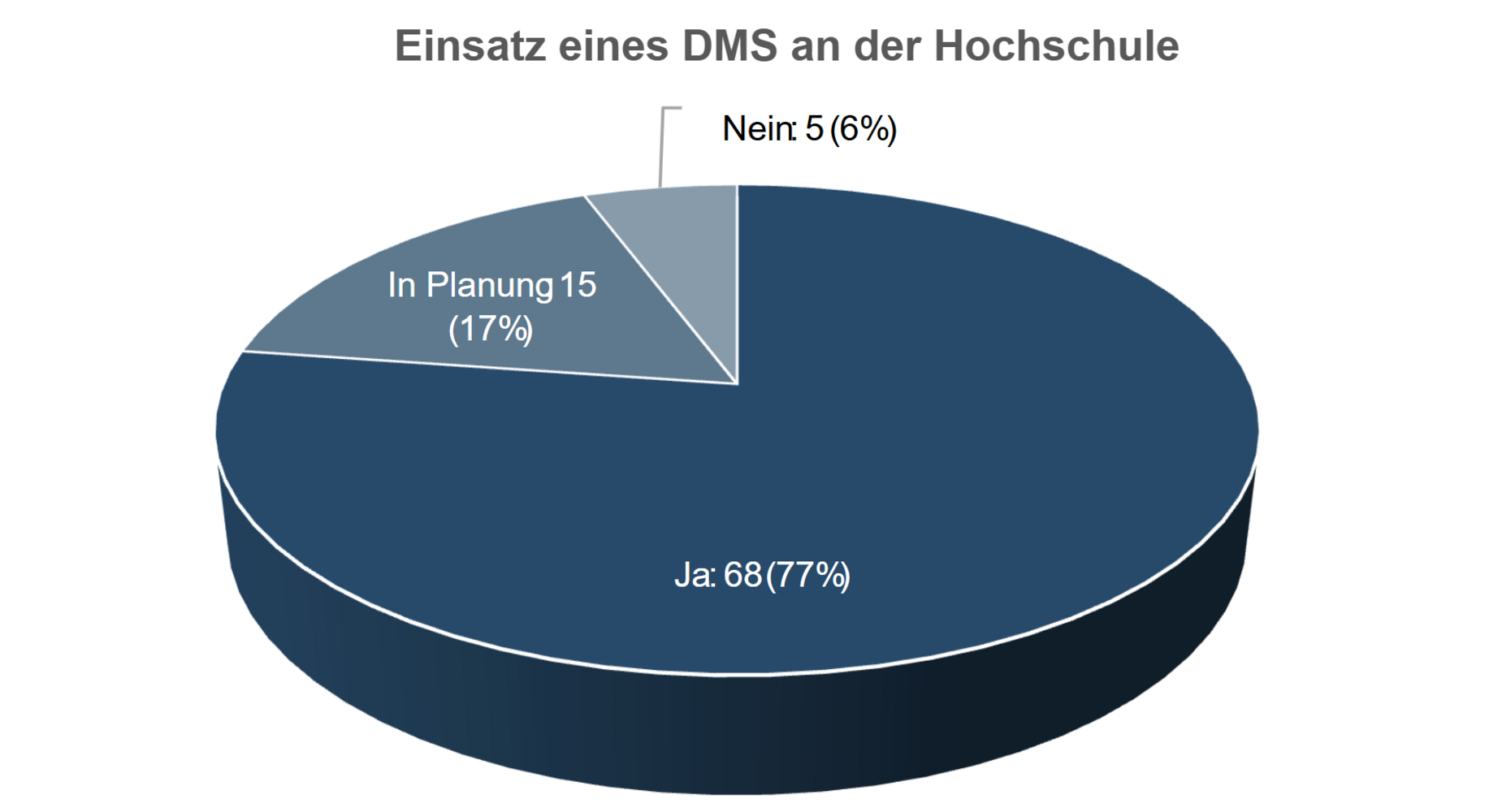 Die Ergebnisse der Umfrage verdeutlichen, dass die Digitalisierung der Hochschulverwaltungen in Deutschland eine neue Entwicklungsphase gegenüber dem Erfassungsstand von vor drei Jahren erreicht hat. Die überwiegende Mehrheit setzt bereits ein Dokumentenmanagementsystem (DMS) im Hochschulbetrieb ein. Während frühere Vorhaben stark technikorientiert waren, steht derzeit die organisatorische und kulturelle Transformation im Mittelpunkt. Hochschulen begreifen Digitalisierung zunehmend als ganzheitlichen Veränderungsprozess, der Fragen der Governance, der Prozessharmonisierung und der Kompetenzentwicklung umfasst.