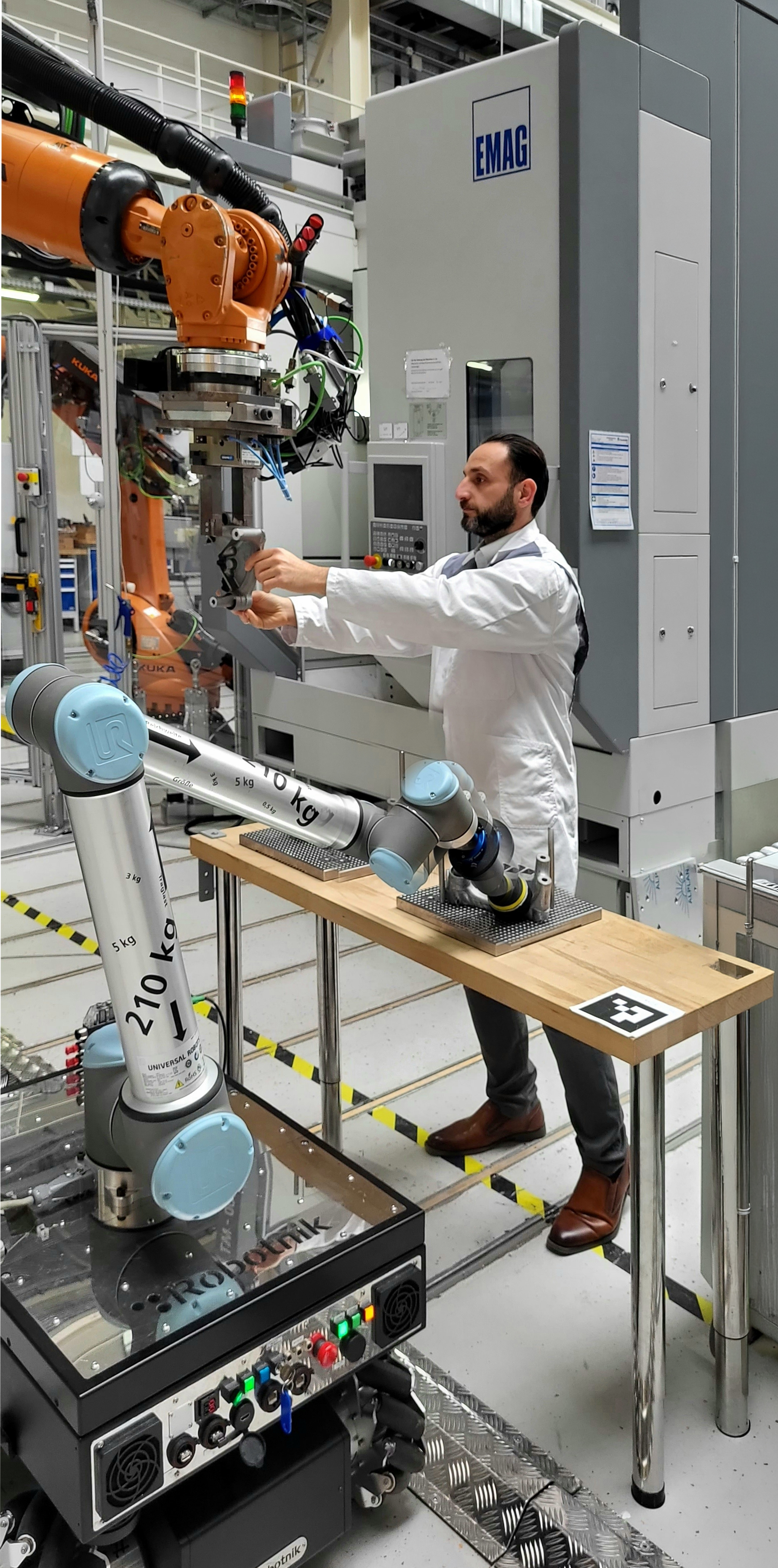 Fraunhofer IAIS is developing the highly specialized AI models required for this. Only a few milliseconds elapse between signal reception, evaluation and the mechanical response of the robot arm. This enables safe collaboration even with heavy-duty robots, which the AI slows down or stops when a person comes too close. By simulating the entire robot cell, Fraunhofer IAIS was able to simulate hazardous situations for training purposes that cannot be replicated in real life.