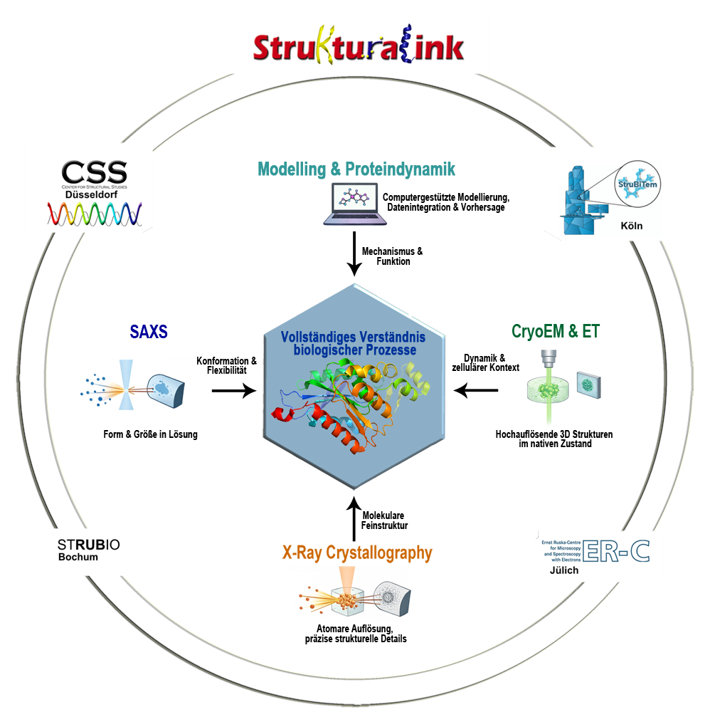 Um alle diese Prozesse zu verstehen, braucht es eine Vielzahl verschiedener strukturbiologischer Methoden, denn keine einzelne Technik kann allein die Komplexität biologischer Prozesse erfassen. Hier setzt „StrukturaLink Rhein-Ruhr“ an: Das neu von der DFG geförderte sogenannte Gerätezentrum vernetzt modernste strukturbiologische Technologien und Expertise an vier Standorten in Nordrhein-Westfalen miteinander. Verfolgt wird ein integrativer Ansatz: Hochauflösende Kryo-Elektronenmikroskopie (Cryo-EM) und Kryo-Elektronentomographie (Cryo-ET), Röntgenkristallographie, Small-Angle-X-ray-Scattering (SAXS) sowie computergestützte Modellierung und Protein-Dynamik-Berechnungen werden gezielt kombiniert, um biologische Prozesse umfassend analysieren zu können.