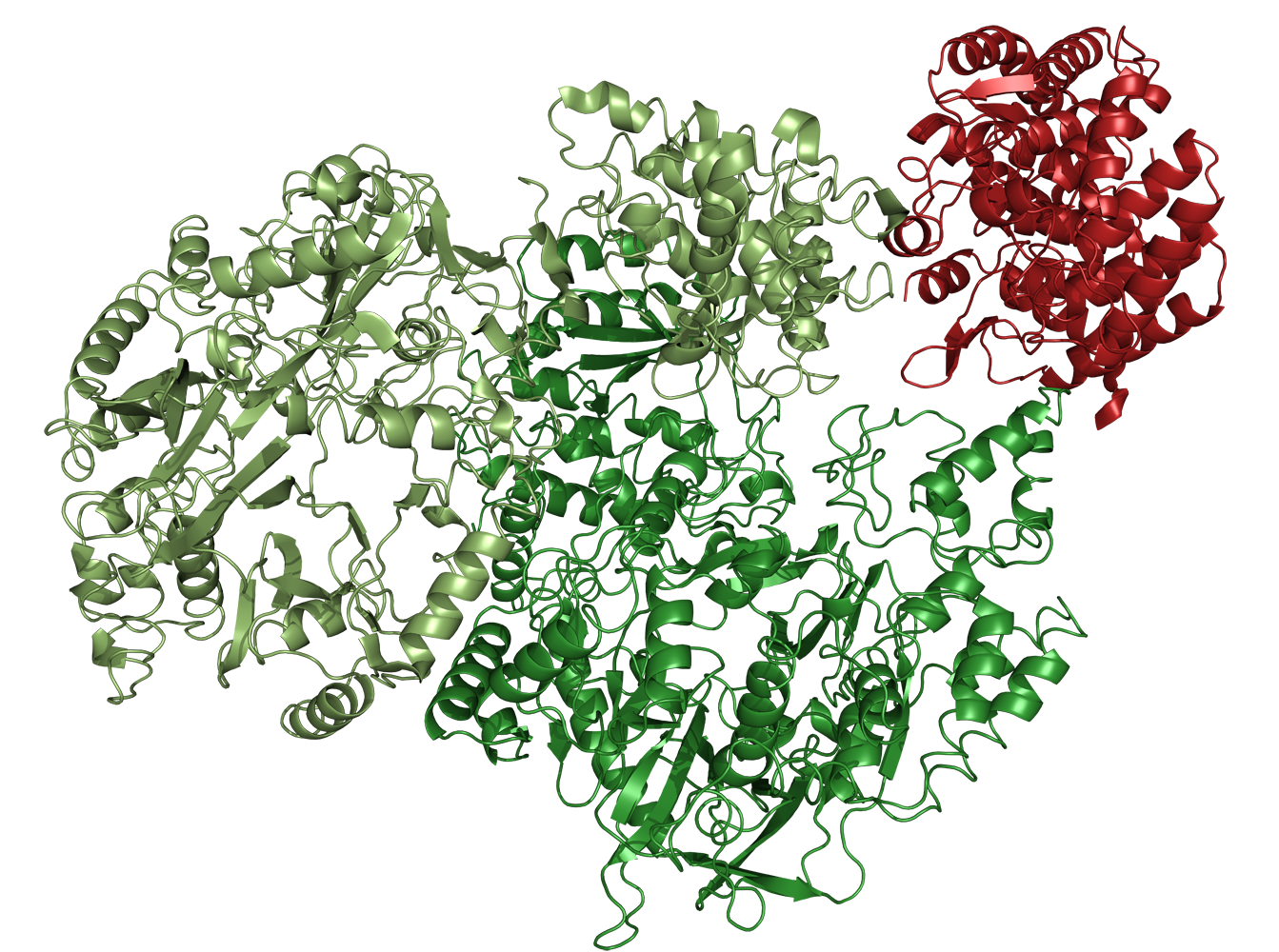 Ergebnis einer Strukturaufklärung, bei der mehrere Methoden kombiniert wurden. Zu sehen ist der Enzymkomplex (MadB2C) des Bakteriums Clostridium maddingley, der zur Reifung des Peptid-Antibiotikums Maddinglicin dient. Mittels Röntgenkristallographie wurde die Struktur des rot dargestellten Teils (MadC) entschlüsselt, während die Struktur des grünen Teil (MadB) mithilfe hochauflösender Cryo-Elektronenmikroskopie bestimmt wurde. Anschließend wurden beide Datensätze computergestützt zu einem Gesamtmodell zusammengefügt. (Bild: HHU / CSS)