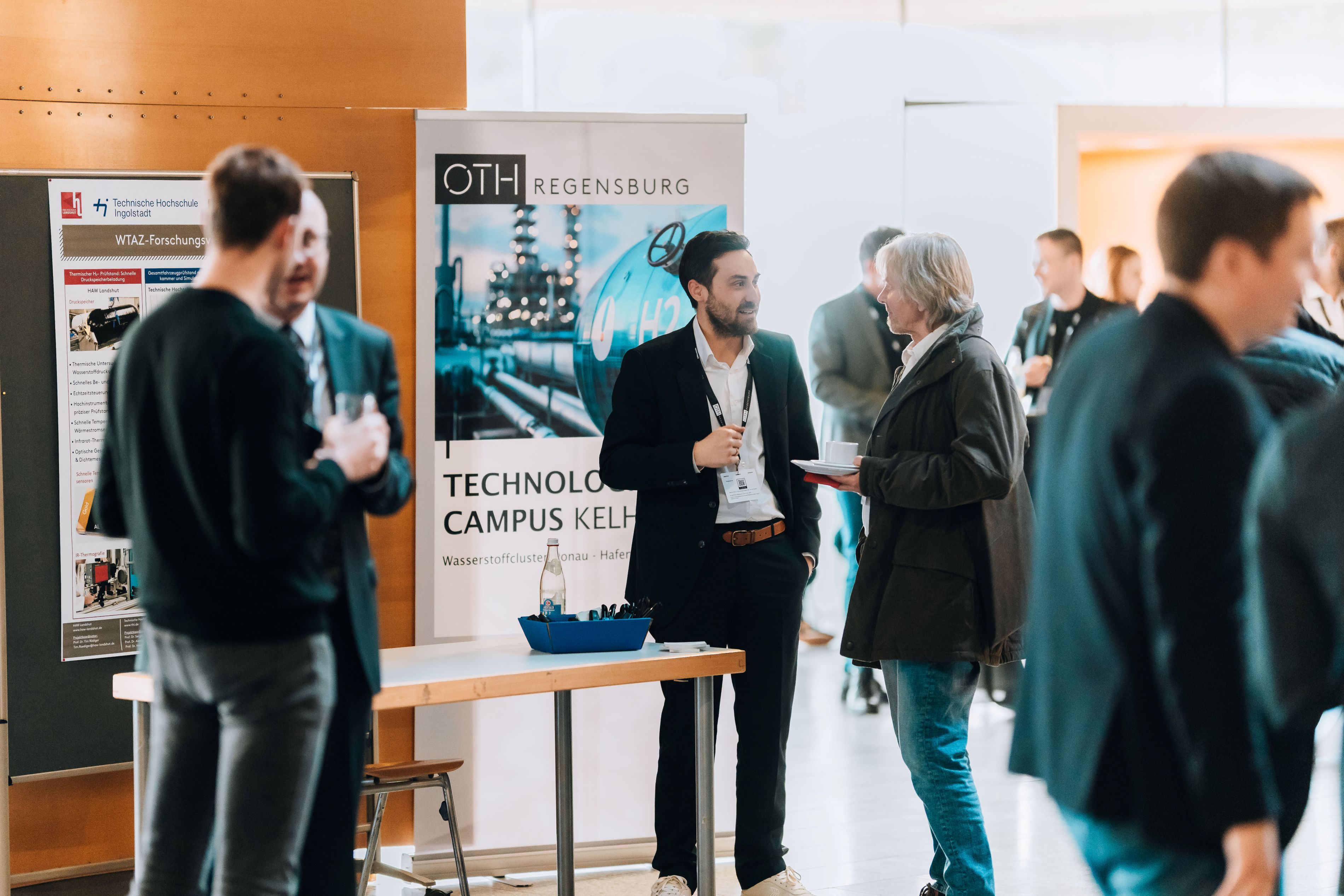 OTH-Präsident Schneider ging näher auf das Leuchtturmprojekt WTAZ ein, an dem die OTH Regensburg gemeinsam mit der Hochschule Landshut und der TH Ingolstadt Wasserstofftechnologien testet, weiterentwickelt und zusammen mit Industriepartnern zur Marktreife führt. Für das WTAZ hat die die OTH Regensburg Mitte Februar den Förderbescheid über rund 12,5 Millionen Euro erhalten. Am Stand im Foyer konnten sich die Teilnehmerinnen und Teilnehmer mit den Projektkoordinatoren vernetzen.
