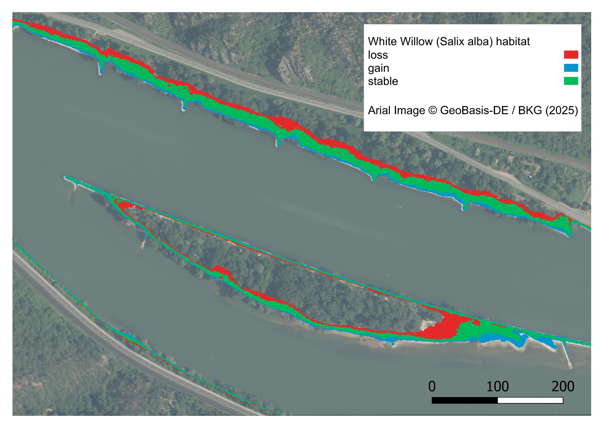 Um zu verstehen, wo die wertvollen Lebensräume in Zukunft vorkommen, haben die Forschenden mehrere Modelle verwendet. Mit einem ökologischen Modell bildeten sie das Vorkommen verschiedener Arten ab, abhängig von Faktoren wie, zum Beispiel für Pflanzen, Temperatur, Neigung der Böschung oder Bodenbeschaffenheit. Mit einem hydrodynamischen Modell berechneten sie weitere Faktoren am Fluss, beispielsweise potentielle Überflutung und Erosion. Indem sie die beiden Modelle kombiniert haben, konnten die Forschenden abschätzen, wo Auenarten in Zukunft vorkommen könnten.
