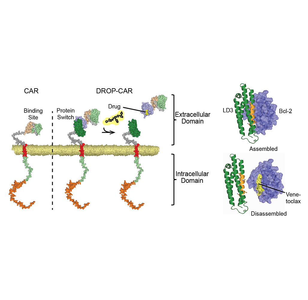 A CAR contains an outer part sticking out of the T cell that recognizes cancerous target cells, and an intracellular part that signals to the T cell to kill, once activated. However, sometimes healthy cells are mistakenly targeted by the same mechanism. The DROP-CAR splits the two receptor parts into two separate components. Adding the drug venetoclax causes the outer part to fall off, prohibiting T cells from binding to other cells in the first place. This method is expected to increase safety of potential CAR T-cell therapies.