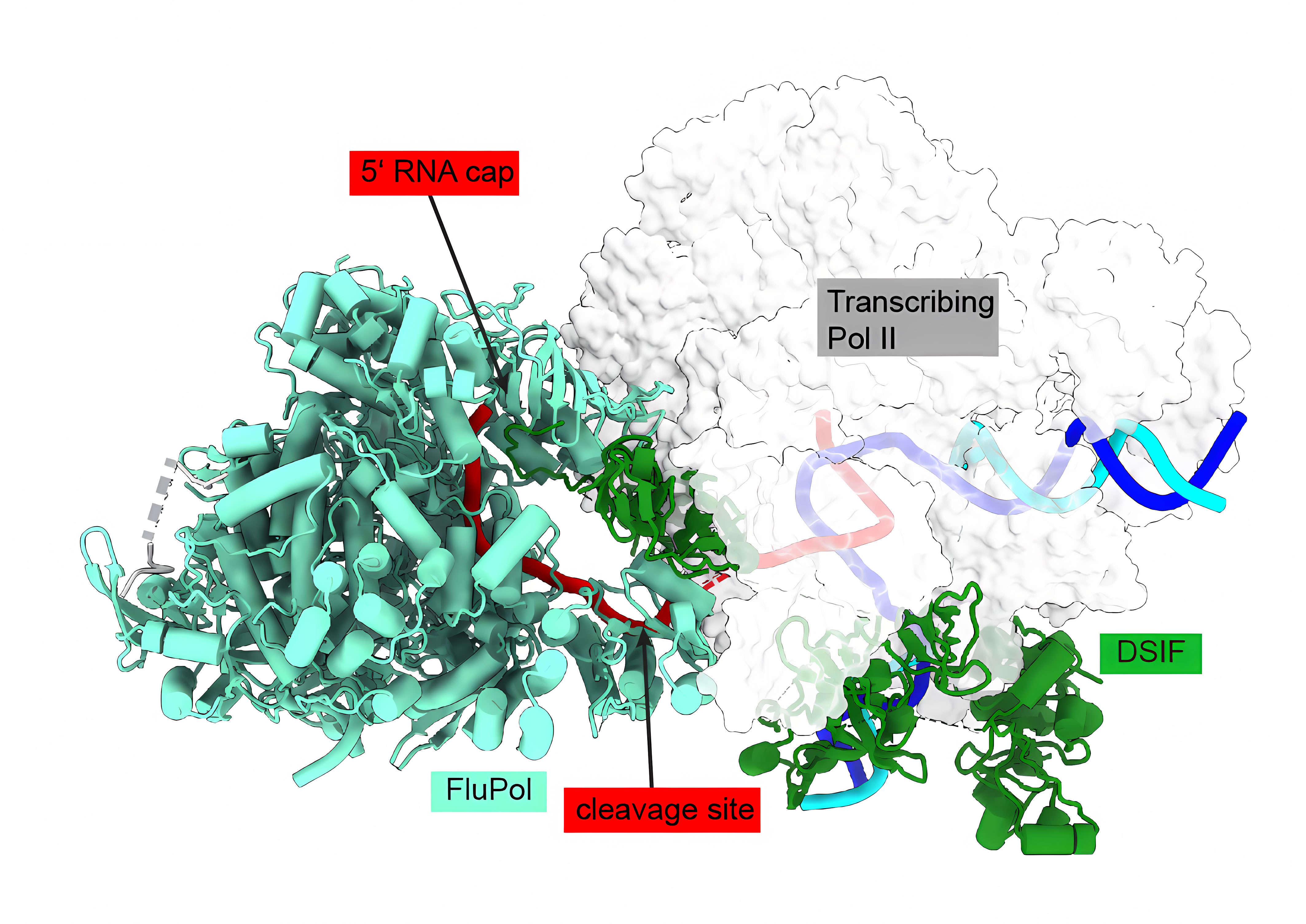 What has been known for many years is that in order to mark its mRNAs with the all-important cap structure, the copying machine of the influenza virus, called FluPol, goes on a hunt, stealing the cap from the host RNA. The host cell then recognizes the viral mRNA as a template for protein production and begins to produce all the proteins necessary for viral replication. It is also already known that FluPol interacts with the host’s copying machinery during this theft. However, the detailed mechanism remained unclear.