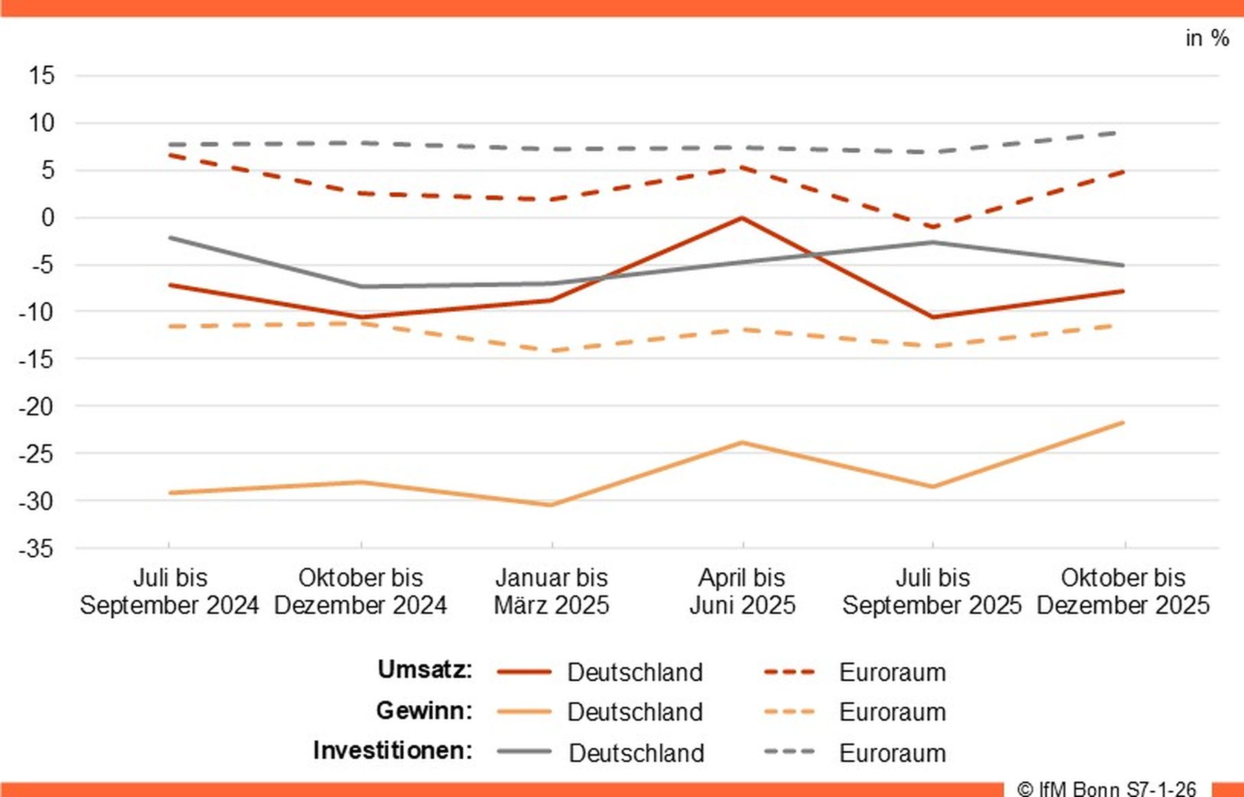 Laut KMU-Barometer des IfM Bonn haben sich zum Ende des Jahres 2025 zwei von drei Kennzahlen – Umsatz und Gewinn – verbessert. Lediglich die Kennziffer Investitionstätigkeit sank geringfügig.