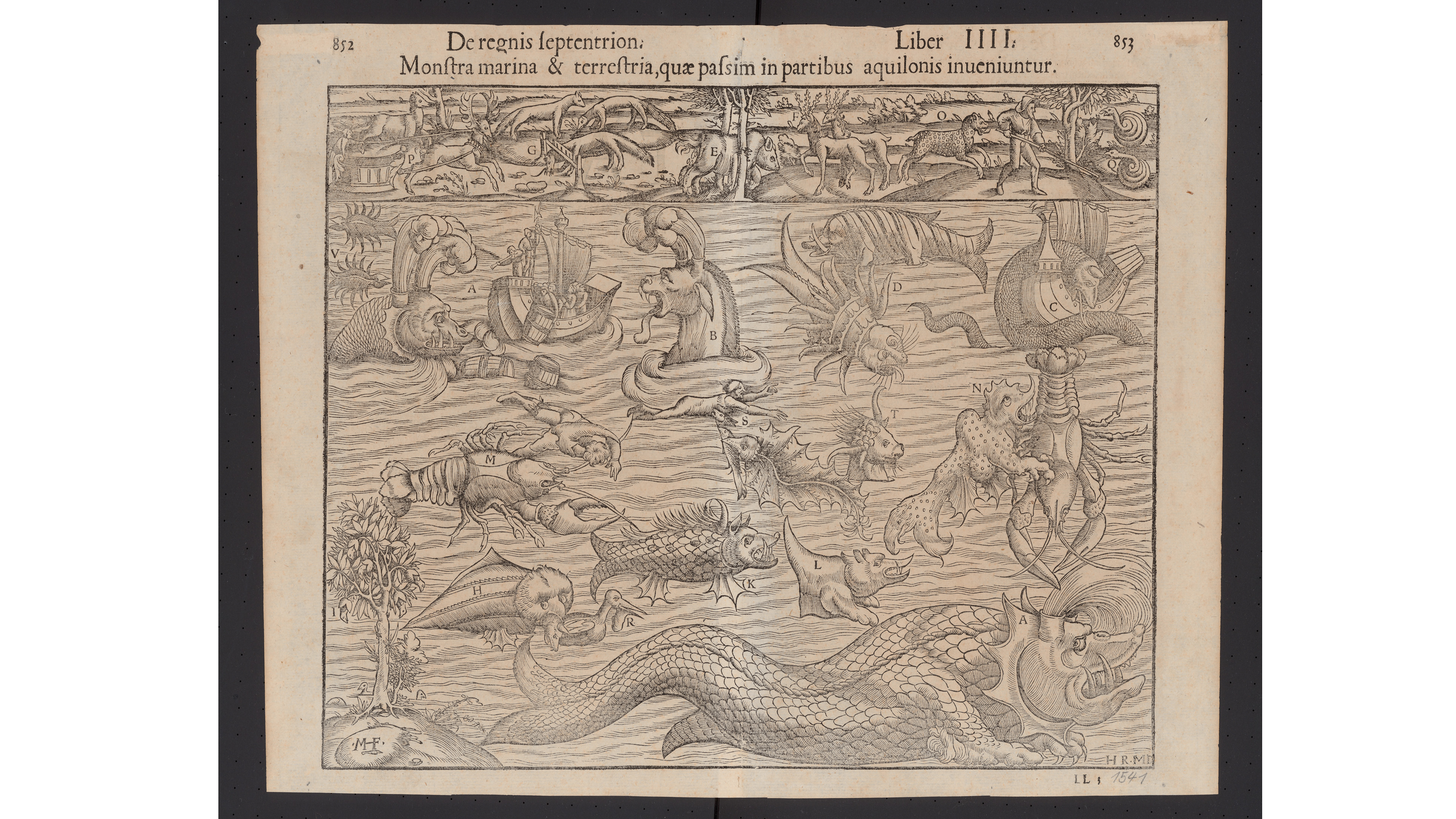 Der erste Beitrag der Reihe rückt einen historischen Druck aus der „Cosmographia“ des Schweizer Gelehrten Sebastian Münster von 1599 in den Fokus. Die Doppelseite mit dem Titel „Aus den Königreichen des Nordens stammen See- und Landungeheuer, die überall in den nördlichen Teilen anzutreffen sind“ zeigt überdimensionierte Seeungeheuer, oft mit ausgeprägten Fangzähnen, die – aus der Tiefe aufgetaucht – Schiffe und Menschen bedrohen. Münsters Werk gilt als die erste umfassende Darstellung des damaligen Wissens zu Geografie, Geschichte und Naturkunde in deutscher Sprache. Zahlreiche Bildmotive lassen sich auf die „Carta marina“ des schwedischen Bischofs Olaus Magnus zurückführen, die 1539 in Rom veröffentlicht wurde und als älteste detaillierte Kartendarstellung Skandinaviens angesehen wird.