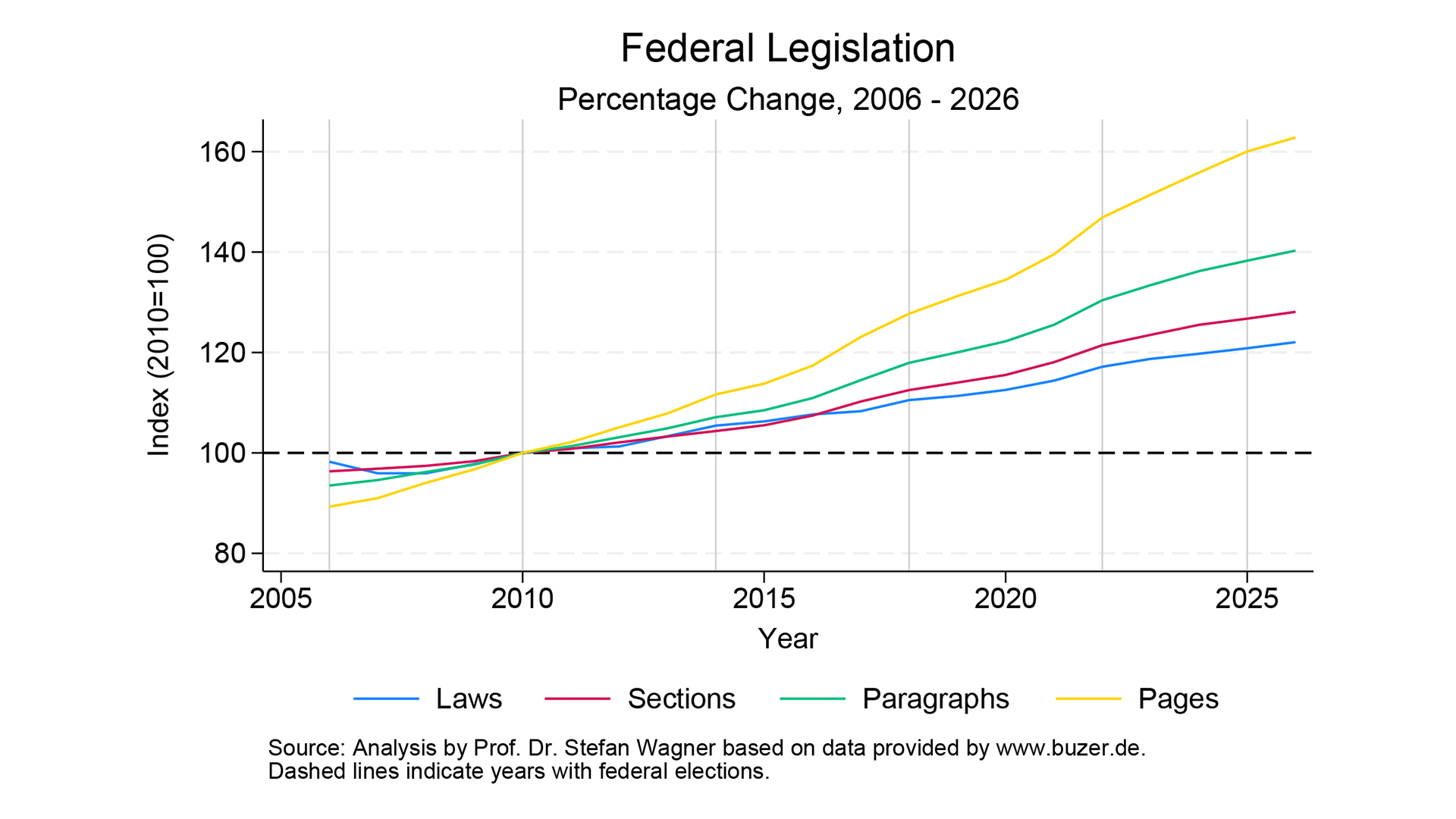 The Bureaucracy Index is based on a systematic evaluation of all applicable federal laws using the database www.buzer.de. It has been compiled since 2024. The scope of a law is measured in so-called normative pages, whereby one standard page comprises 1,500 characters including spaces.