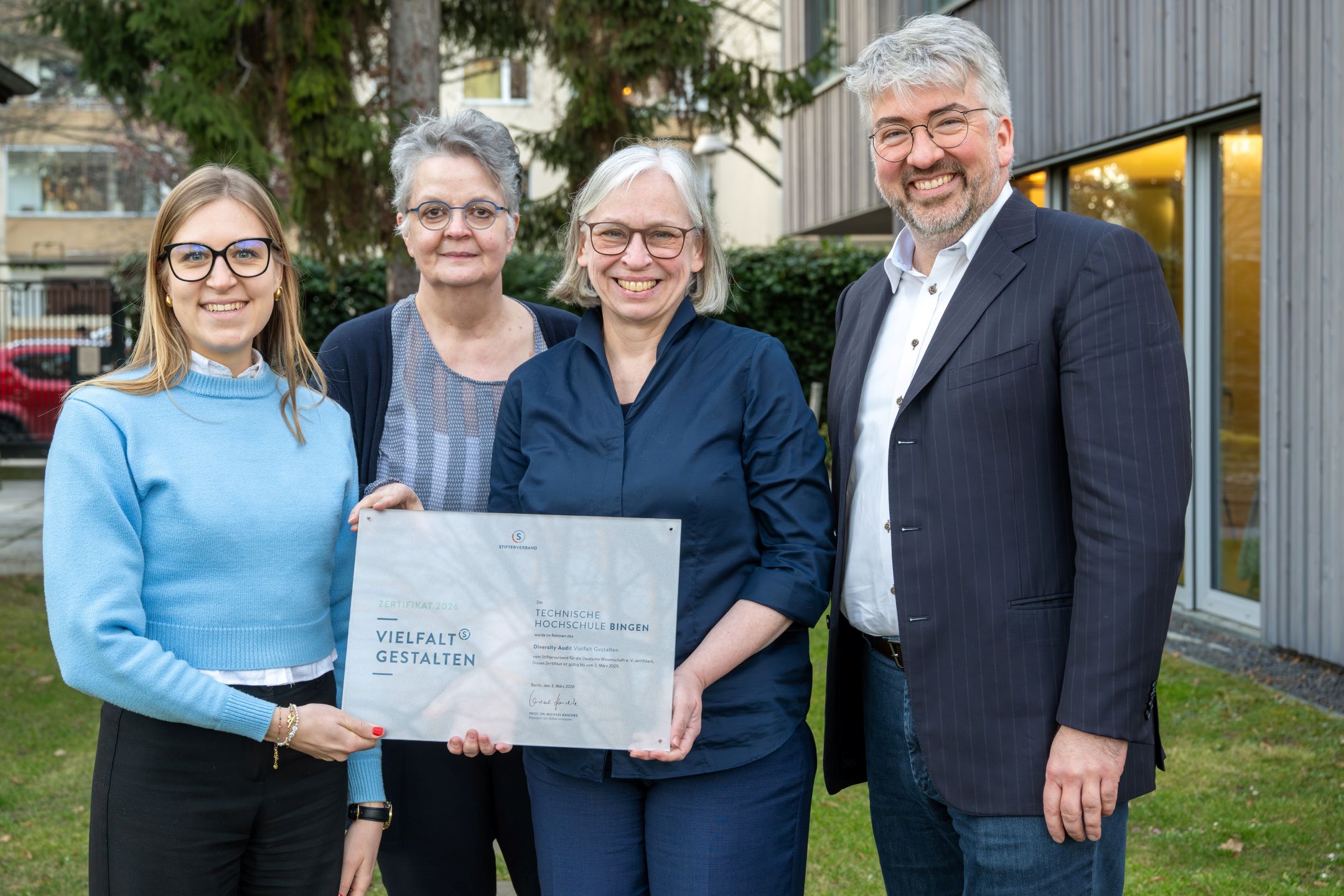 Berlin – Die Technische Hochschule (TH) Bingen hat erfolgreich am Diversity Audit des Stifterverbands teilgenommen. Begleitet wurde das Audit an der TH Bingen vom Auditor Prof. Dr. Christian Ganseuer. Am 3. März 2026 nahmen Prof. Dr. Antje Krause, Präsidentin der TH Bingen, Vanessa Fischer, Diversity Managerin, und Hannelie Bohnes, Leiterin des Projekts FH-Personal, in Berlin das Zertifikat „Vielfalt gestalten“ vom Stifterverband entgegen.