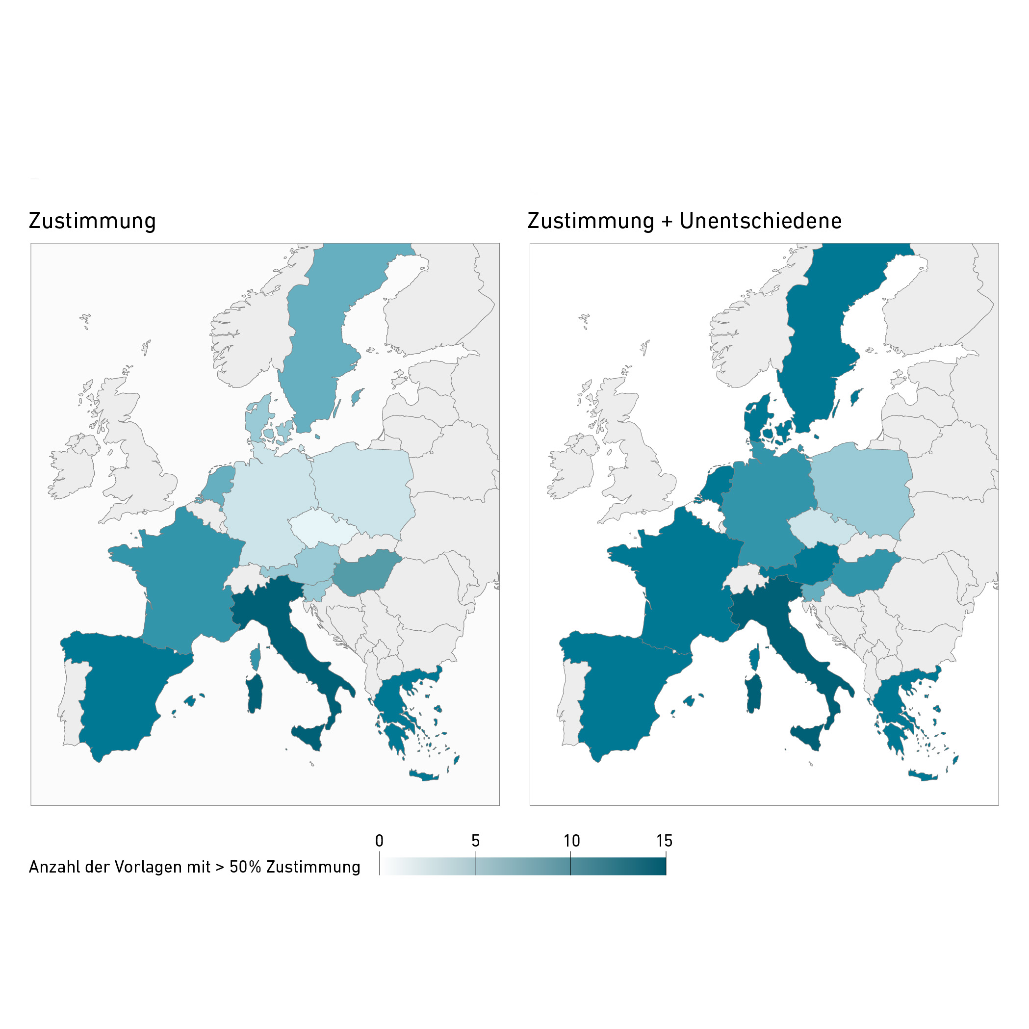 Im internationalen Vergleich stellte sich heraus, dass der Anteil der Unentschiedenen in allen befragten Ländern relativ hoch ist. Würden innerhalb dieser Gruppe jene Personen, die bei einzelnen Massnahmen «weder dafür noch dagegen» angeben, in Richtung Zustimmung kippen, kämen 10 von 15 in der Studie abgefragten Vorlagen zustande. Ohne ihre Unterstützung hingegen wären es lediglich vier.
