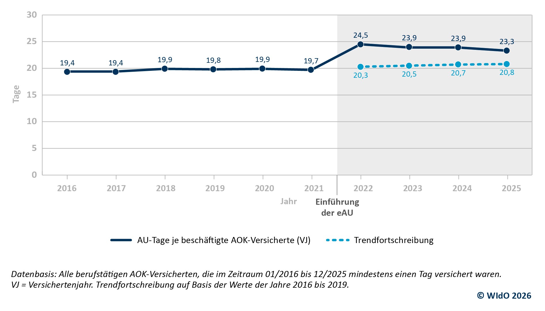Im Jahr 2025 sind die bei der AOK versicherten Beschäftigten im Durchschnitt 23,3 Tage krankheitsbedingt ausgefallen. Damit liegen die Fehlzeiten leicht unter dem Niveau des Vorjahres mit 23,9 Krankheitstagen und etwa einen Tag unter dem bisherigen historischen Höchststand von 2022 mit 24,5 Tagen. Die Analyse des Wissenschaftlichen Instituts der AOK (WIdO) zeigt, dass das hohe Niveau der Fehlzeiten seit 2022 in erster Linie durch einen statistischen Effekt infolge der Einführung der elektronischen Arbeitsunfähigkeitsbescheinigung (eAU) zu erklären ist. Die eAU hat dazu geführt, dass insbesondere kurzzeitige Erkrankungen vollständiger erfasst worden sind.
