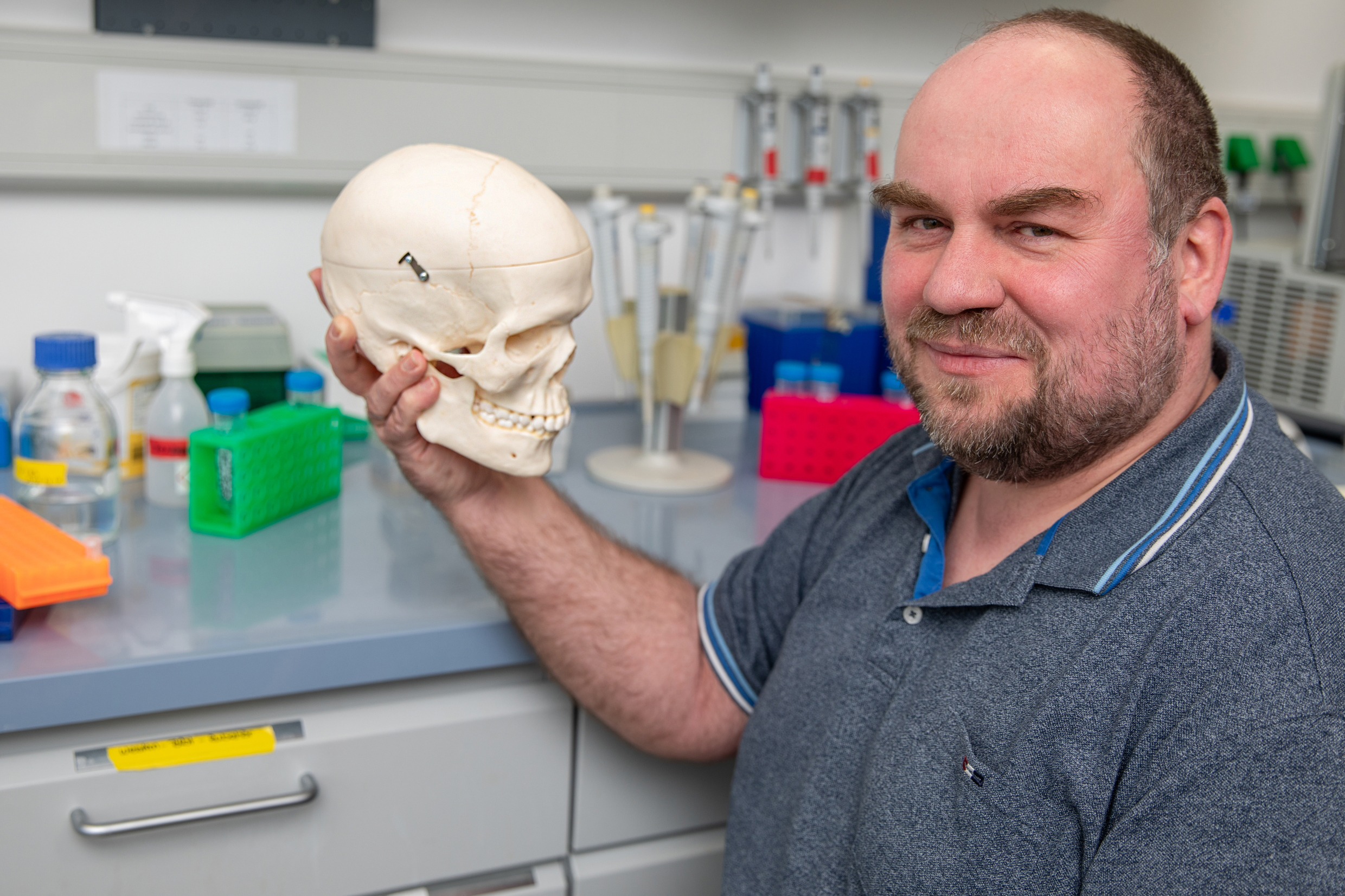 Further investigation of the potential drug candidates is being carried out at LUH. There, a team led by Prof. Dr Dominik Egger, head of the Biofabrication for Drug Testing department at the Institute of Cell Biology and Biophysics, is testing the efficacy of the previously identified active substances. Until now, there has been a lack of suitable laboratory test models based on human cells. This is now set to change. ‘We are building a three-dimensional, miniaturised model of a cranial suture from specially modified stem cells and biomaterials,’ says Professor Egger, who is co-applicant for the project. The model will be slightly smaller than one cubic centimetre and will be developed on a hydrogel basis. The researchers want to test potential active substances on both healthy and disease-altered stem cells that carry the genetic defect.