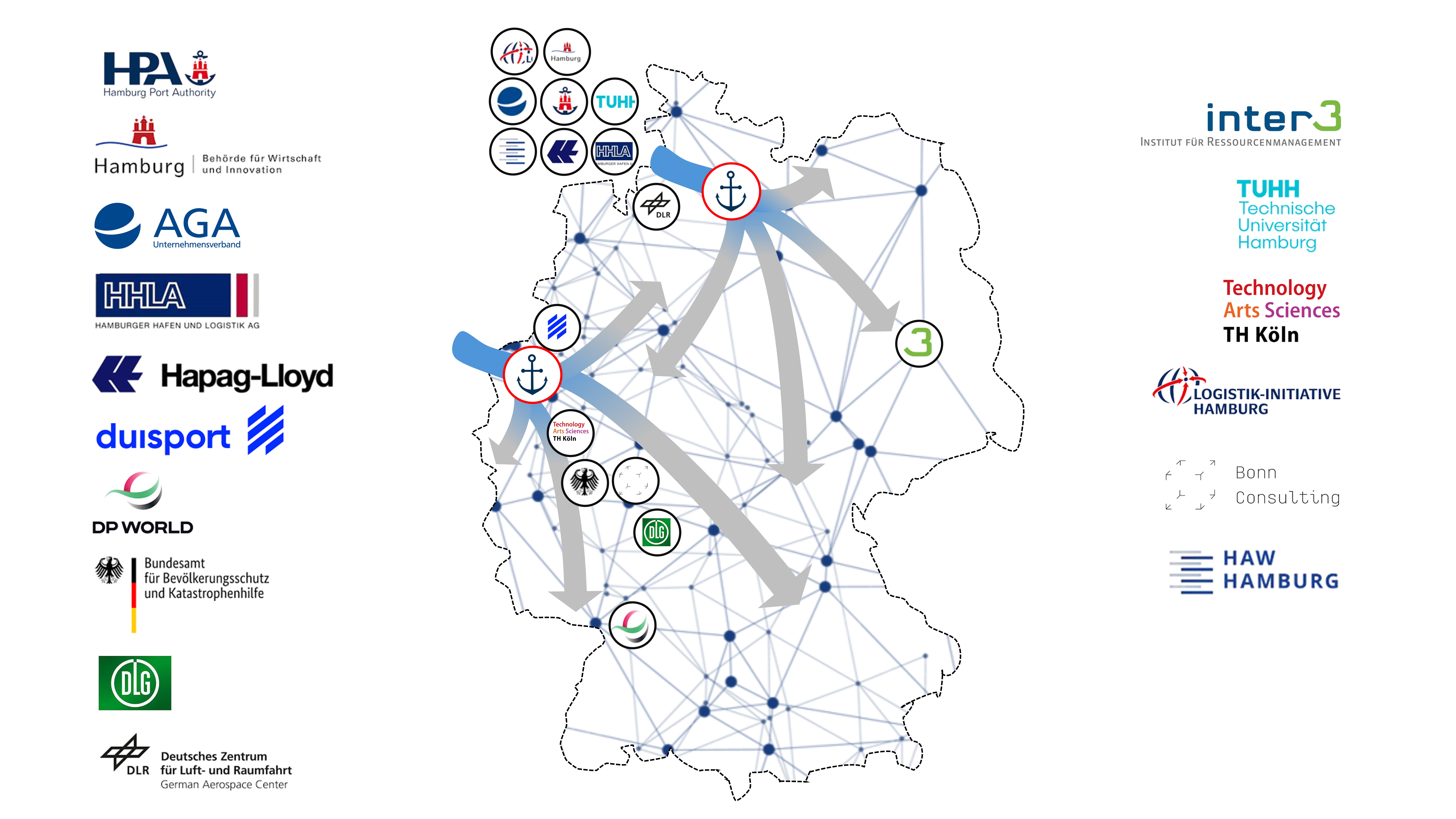 Neben der Gesamtkoordination übernimmt inter 3 die Analyse der politisch-rechtlichen Rahmenbedingungen und von möglichen Szenarioverläufen. Die TU Hamburg bringt ihre wissenschaftliche Expertise in maritimer Logistik und Analyse kritischer Infrastrukturen ein, während die TH Köln insbesondere zu Methoden des Risiko- und Krisenmanagements sowie zur Lieferkettenanalyse arbeitet. Die HAW Hamburg entwickelt ein Schulungsmodul und bringt ihre Kompetenz im Medizinbereich ein.