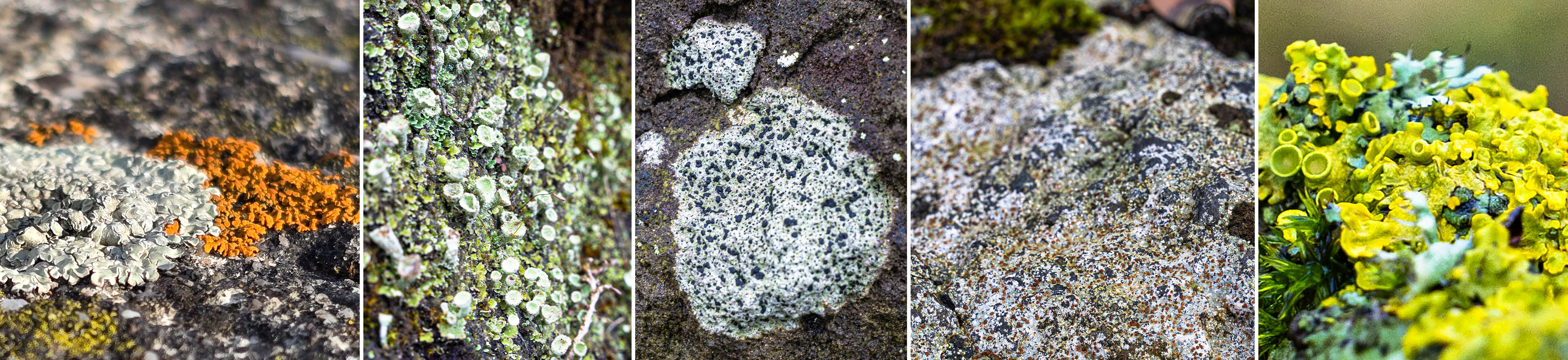 Verschiedene Flechtenarten (v.l.): 1.: Mauerflechte (Protoparmeliopsis muralis, graugrün) und Zierliche Gelbflechte (Rusavikia elegans); 2.: Becherflechte (Cladonia spec.); 3. und 4.: verschiedene Krustenflechte, teils mit schwarzen Apothecien (Mitte); 5.: Wand-Gelbflechte (Xanthoria parietina, gelb) und Zarte Schwielenflechte (Physcia tenella, grün) – die runden Scheiben sind die Apothecien von Xanthoria parietina. (Fotos: HHU / Arne Claussen)