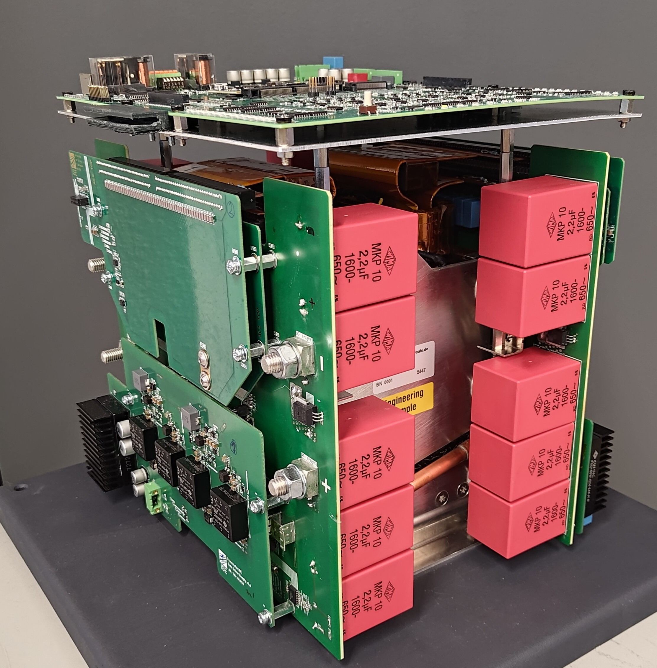 Eine innovative Komponente des Projekts ist ein neuer ultrakompakter galvanisch trennender DC/DC-Wandler mit einer Übertragungsleistung von 250 kW. Um eine Ladeleistung von 1 MW bereitzustellen, werden vier dieser modularen Wandler parallelgeschaltet. Der Stromrichter basiert auf der grundlegenden Topologie eines Serien-Resonanz-Wandlers. Er arbeitet mit einer sehr hohen Taktfrequenz von bis zu 200 kHz, wodurch induktive Bauelemente wie der Hochfrequenz-Transformator und der Resonanzkreis kleiner ausgeführt werden können. Dies reduziert den Materialeinsatz und die Größe des Wandlers. Dank der hohen Taktfrequenz erreicht der Wandler eine volumetrische Leistungsdichte von 9 kW/l, was bei einer maximalen Effizienz von 99,26 Prozent in diesem Leistungsbereich ein weltweites Novum darstellt.