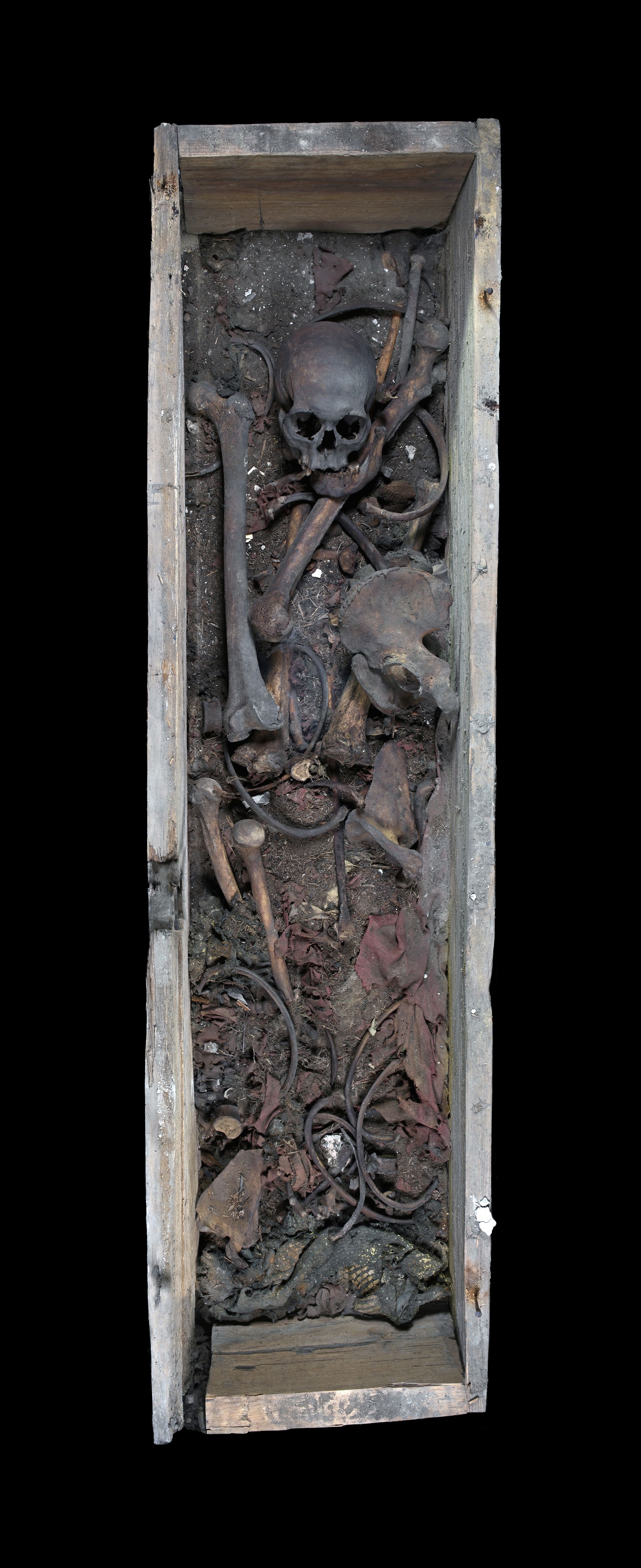 Inside the wooden coffin, textile and plant remains, sediment, and bones were found scattered about. From mid-June 2025 to early February 2026, the find situation was thoroughly documented, and the contents of the coffin were gradually removed.