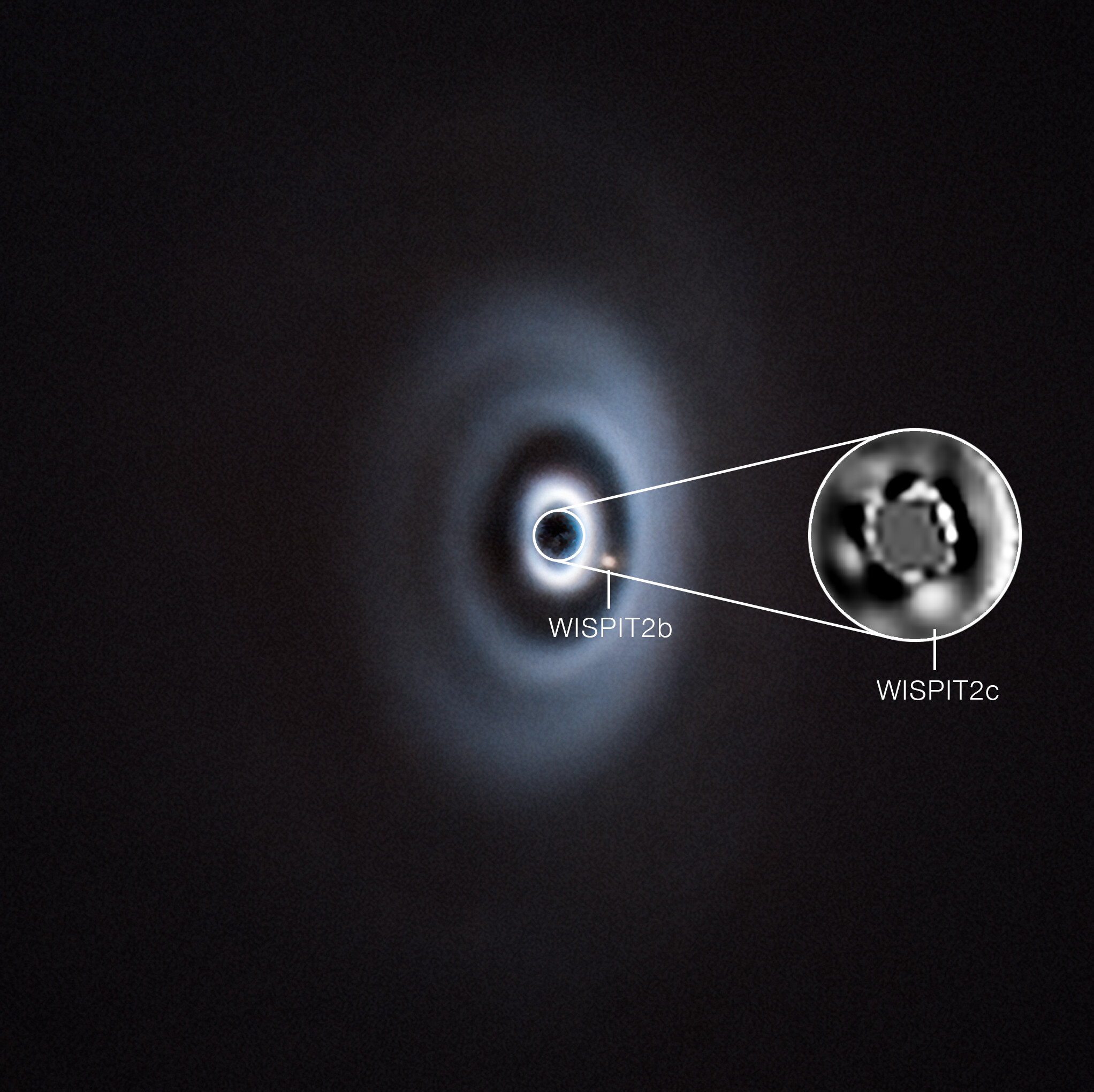 Beide Planeten in WISPIT 2 befinden sich in deutlichen Lücken innerhalb der Staub- und Gasscheibe, die den jungen Stern umgibt. Diese Freiräume resultieren aus dem Wachstum der Planeten: Partikel in der Scheibe sammeln sich an und verklumpen, wobei ihre Gravitation zunehmend Material anzieht, bis sich ein Planetenembryo formt. Das verbleibende Material bildet um jede Lücke herum charakteristische Staubringe.