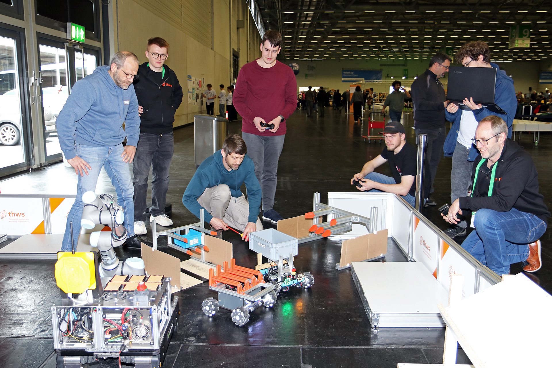 Wenn es darum geht, den autonomen Betrieb zu programmieren, stehen die Auszubildenden in regem Austausch mit SWOT-Teammitglied Maximilian Streng, der zurzeit sein Masterstudium an der THWS abschließt. Mit dem Start der neuen Brückenliga haben sich auch die Aufgaben geändert: Es geht zwar immer noch um das Aufnehmen und Transportieren von Objekten, aber nun kommt noch das Zusammenbauen von Werkstücken hinzu, in diesem Fall mit Lego-Duplo-Steinen. Hingegen gibt es für Fehler wie Kollisionen weniger Punktabzug als zuvor. „Die Objekterkennung wird für uns nun einfacher“, schildert Streng. „Aber das Zusammenbauen ist schwieriger, das haben wir bisher noch nicht gemacht.“ Daher sei das Treffen in Köln weniger ein klassischer Wettbewerb, sondern diene eher dazu, die neuen Aufgaben und Regeln festzulegen und auszutesten, erläutert Prof. Dr. Kaupp. „Mir persönlich ist wichtig, dass die Aufgaben industrierelevant bleiben. Jetzt haben wir noch etwas Zeit, daran zu arbeiten, bevor es im Juli zu den Weltmeisterschaften nach Südkorea geht.“