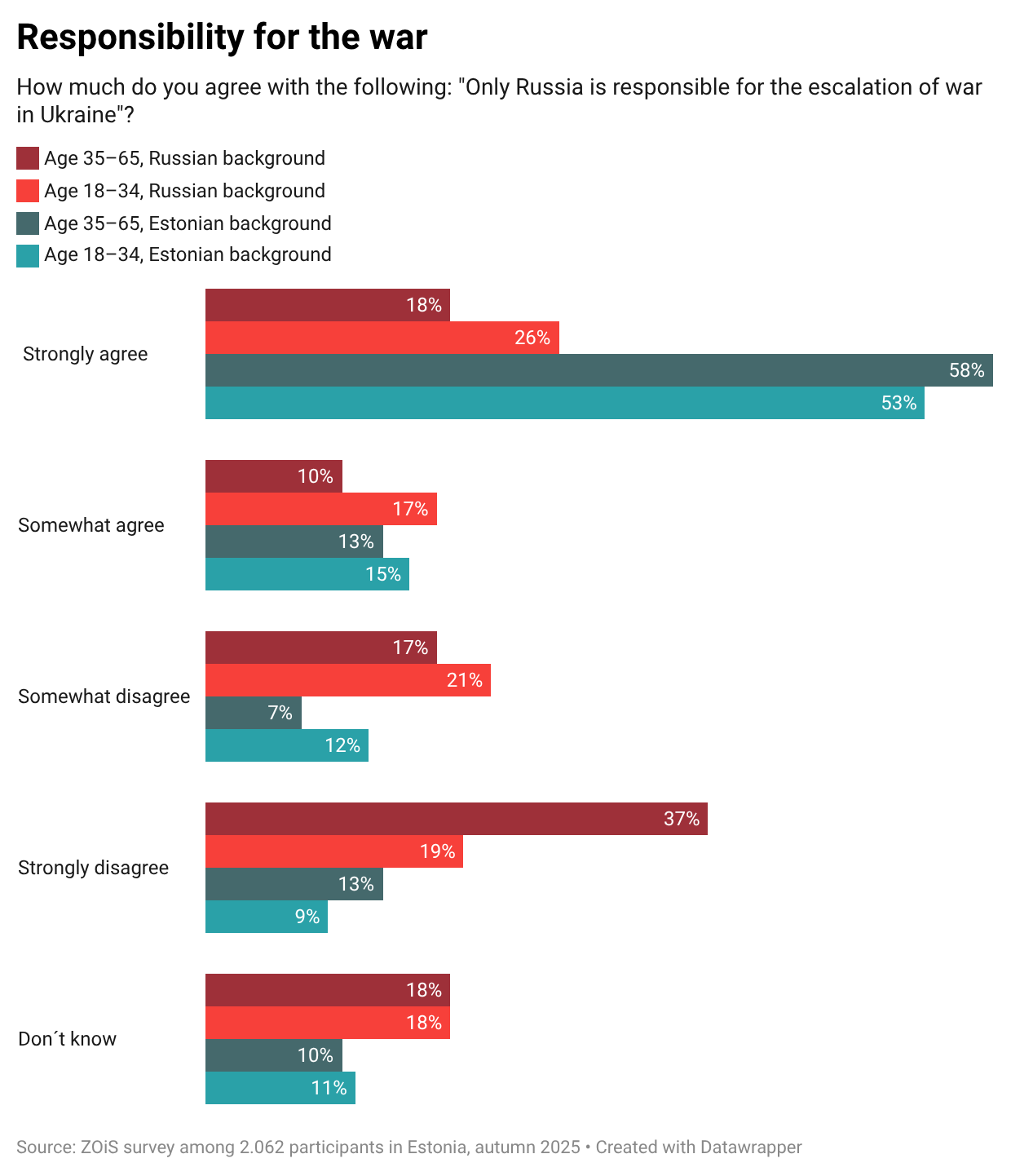 Ein ausgeprägter Unterschied zeigt sich mit Blick auf den Krieg gegen die Ukraine. Über 50 % der estnischen Befragten ohne familiären Hintergrund in Russland stimmen der Aussage, dass Russland allein für den Krieg verantwortlich ist, vollständig zu. Diese Einschätzung teilten dagegen nur ein Viertel der jüngeren und 20 % der älteren Befragten mit familiärem Hintergrund in Russland.