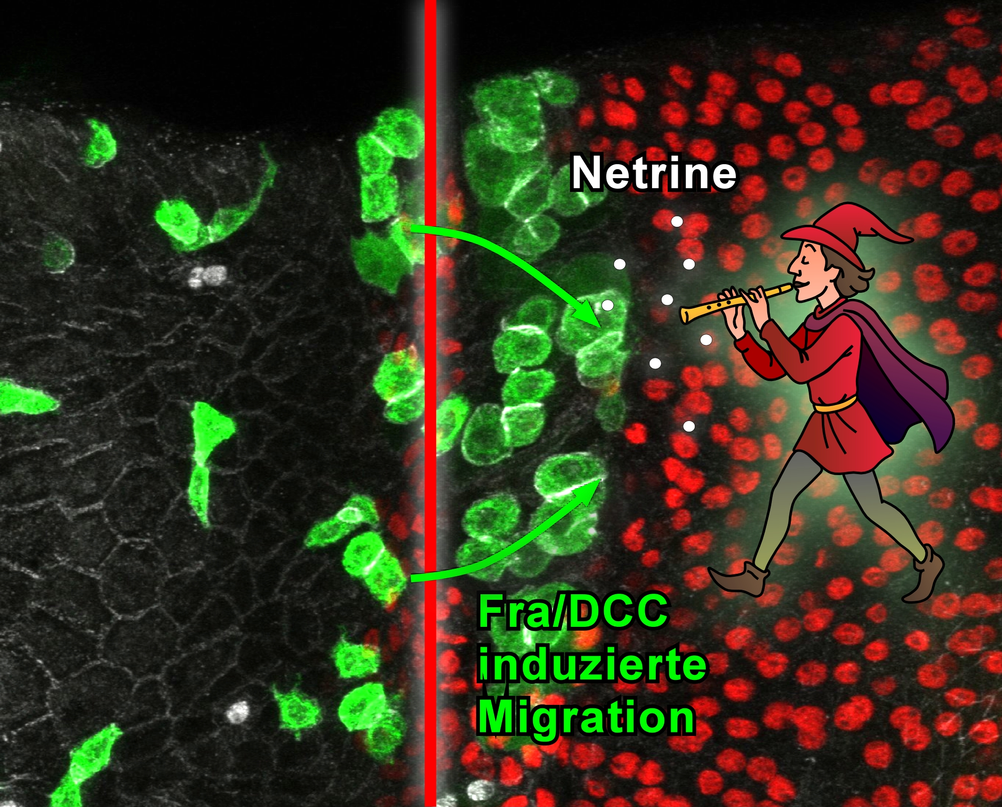 Der neu entwickelte Hamelin-Assay zeigt, wie Netrin-Moleküle (weiße Kreise) über die Fra/DCC-Rezeptoren in intestinalen Stammzellen (grüne Zellen) die Wanderung von Krebszellen über Organgrenzen (rote Linie) hinaus induzieren. Der Rattenfänger, der die Netrine aus seiner Flöte ausstößt, symbolisiert, wie die sich die losgelösten Krebszellen durch den Körper bewegen, um später Metastasen zu bilden. (Bild: HHU / Tobias Reiff)