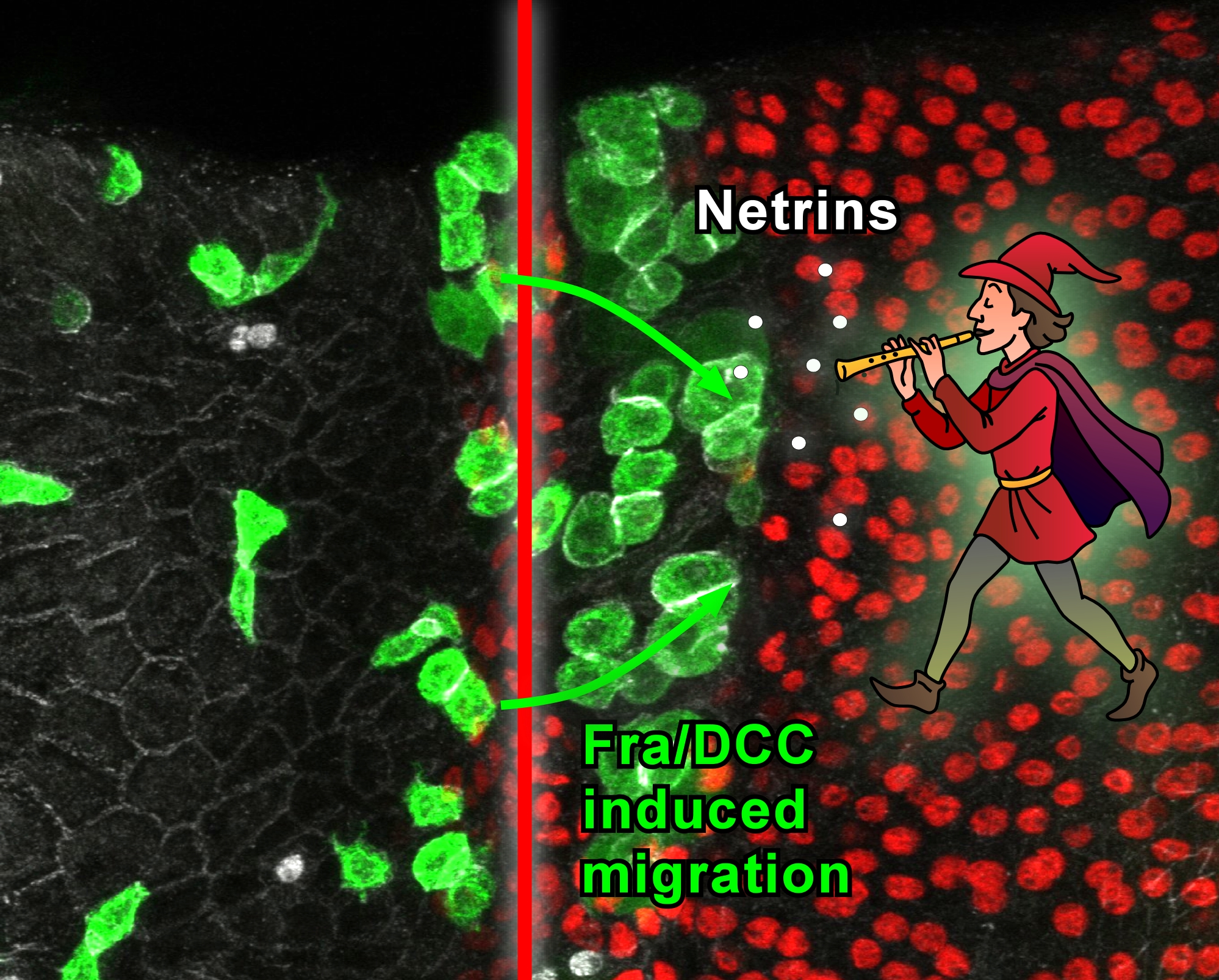 The newly developed Hamelin Assay shows how Netrin molecules (white dots) induce the migration of cancer cells through organ boundaries (red line) via the Fra/DCC receptors in intestinal stem cells (green cells). The rat-catcher blowing the Netrins out of his pipe symbolises how the disseminated cancer cells move through the body to form subsequent metastases. (Image: HHU/Tobias Reiff)