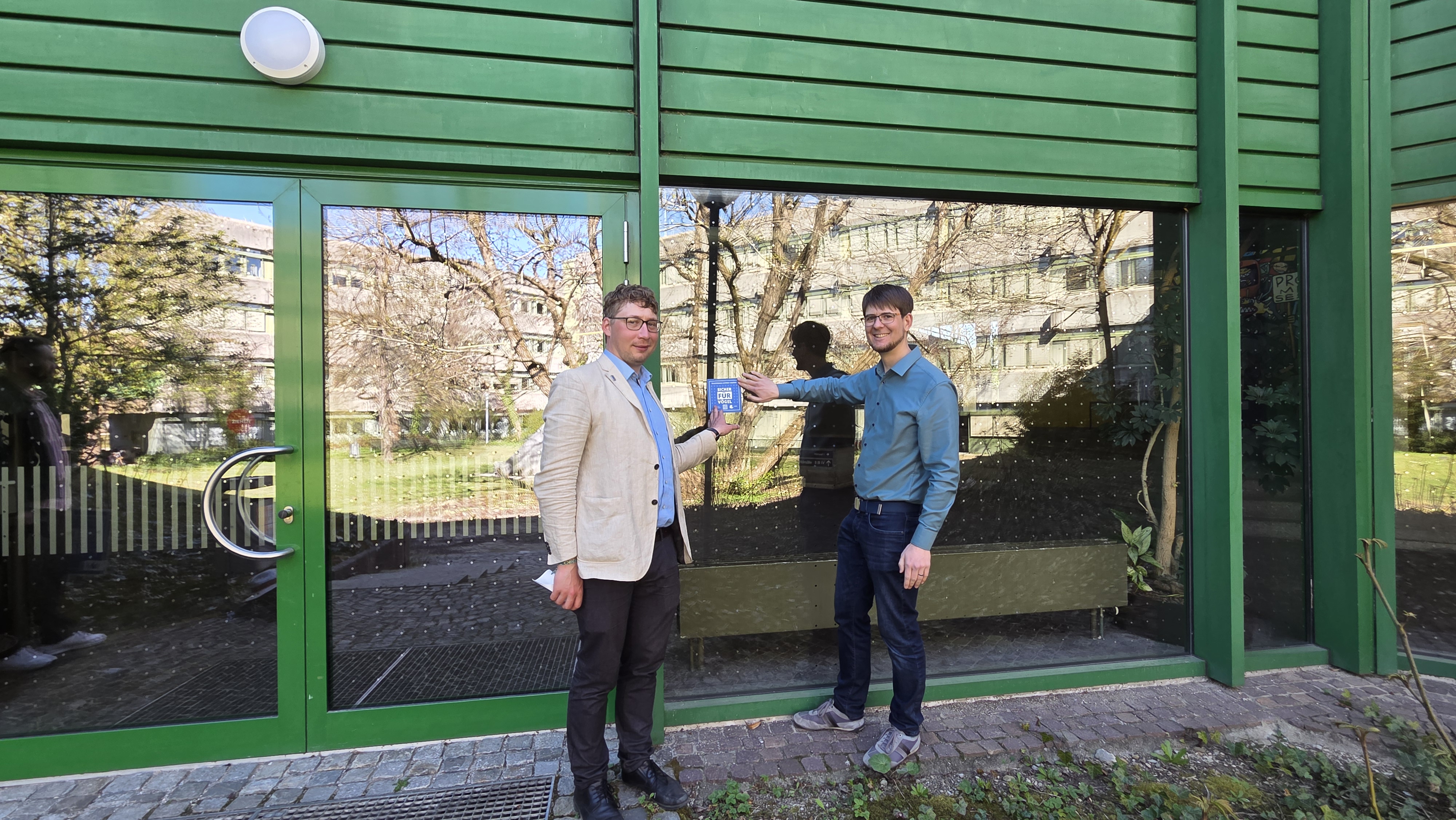 Die Plakette wurde am 8. April 2026 vor der Zentralbibliothek der Universität Augsburg durch Dr. Peter Stimmler vom Landesbund für Vogel- und Naturschutz in Bayern e.V. überreicht. Anwesend war u.a. auch der Vorsitzende der Kreisgruppe Augsburg des Landesbundes für Vogelschutz, Dr. Martin Trapp. Für die Universität Augsburg nahm Prof. Dr. Axel Tuma die Auszeichnung entgegen. Er dankte allen an den Maßnahmen Beteiligten und betonte, dass die Universität auf das bislang Erreichte stolz sein könne.