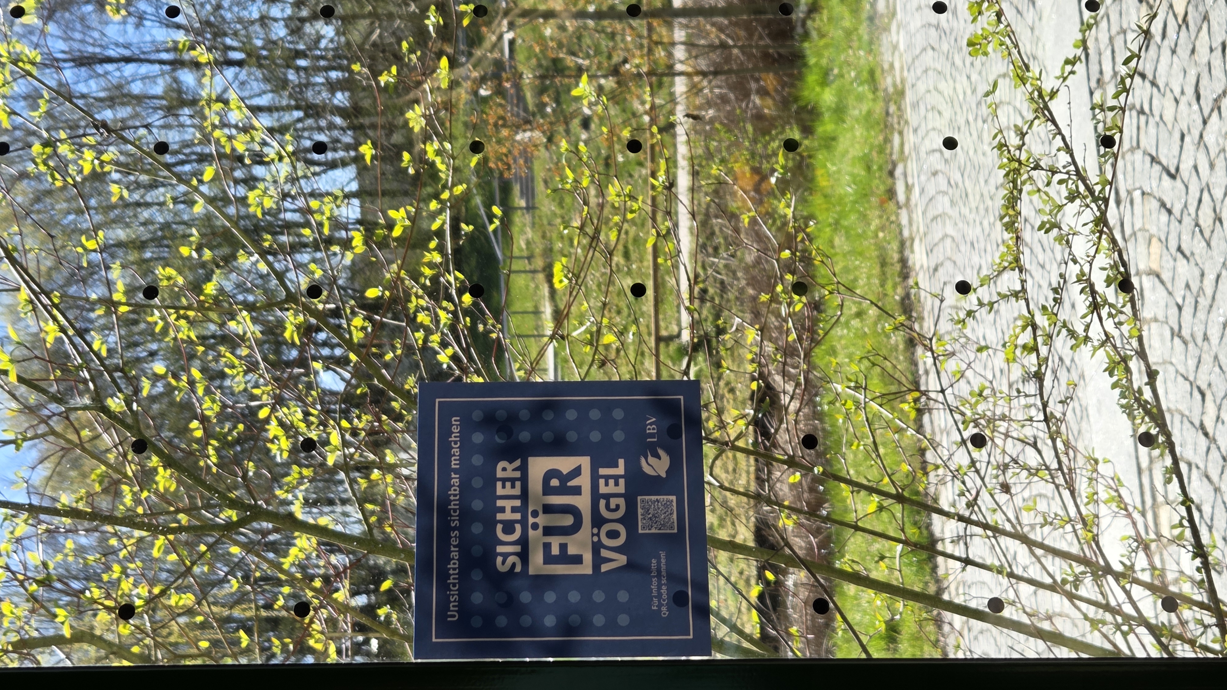 Zum Einsatz kam eine wissenschaftlich geprüfte, hochwirksame Vogelschutzfolie im 9/90-Millimeter-Raster. Sie bewirkt, dass Glasflächen für Vögel als Hindernis besser wahrnehmbar sind, wodurch das Risiko von Kollisionen nachweislich um bis zu 90% verringert wird. Die heute verwendeten Punktmuster haben sich im Test als weitaus wirksamer erwiesen als die herkömmlichen Greifvogel-Silhouetten.