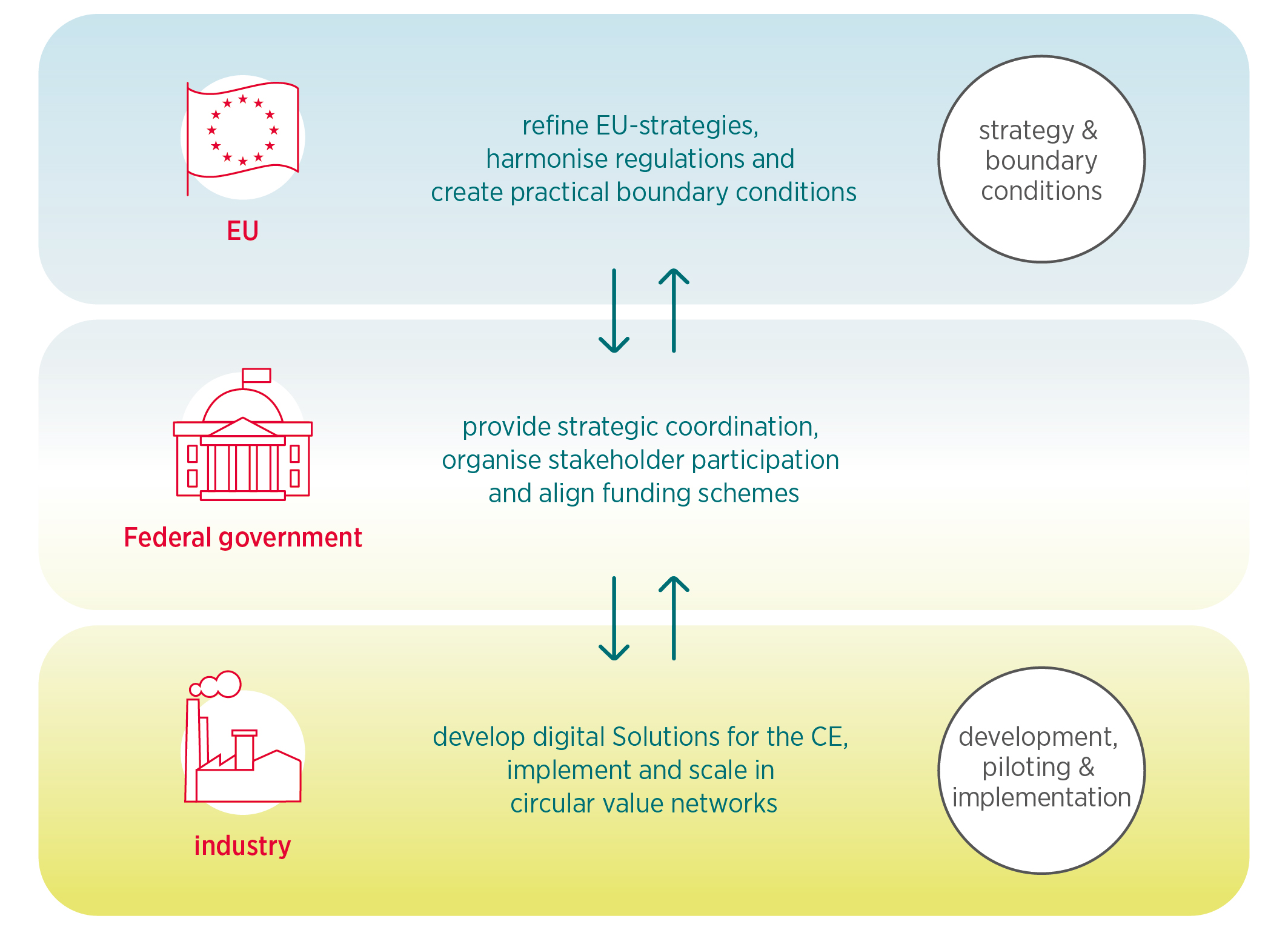 A functioning CEIS can not only advance the circular economy but also provide new impetus for business and public administration. Establishing this requires coordinated efforts over a period of years. It is crucial to make use of the existing momentum for innovation and continue to develop it with a specific aim in mind. Among other things, the focus is on: