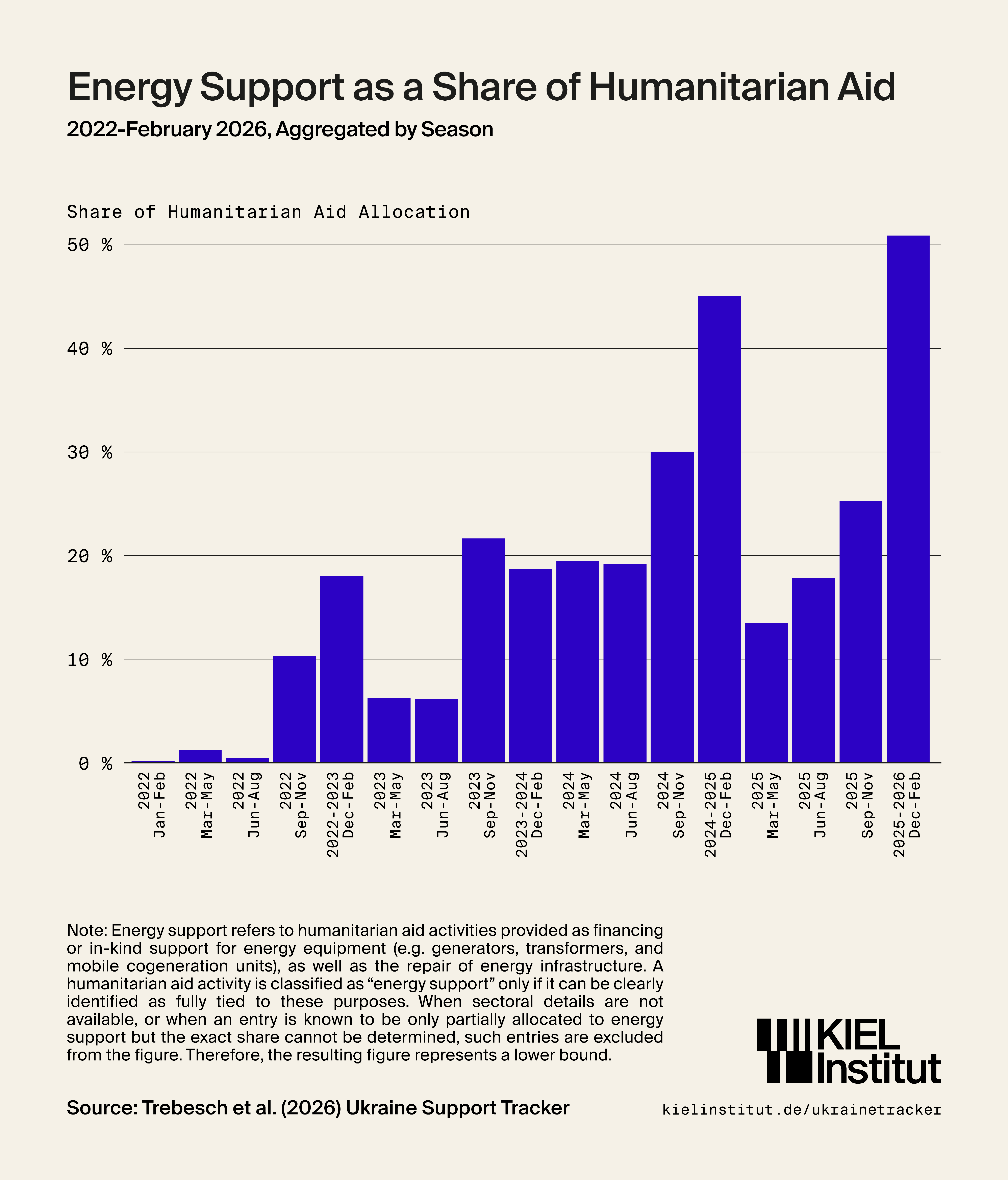 Ukraine’s energy support has become a key focus of humanitarian aid to the country: with almost EUR 1 billion allocated, the share of energy support reached more than half of all humanitarian aid during the last winter. A large share of the funding was channeled through pooled international financing instruments, underscoring their growing importance. These findings are based on the latest update of the Ukraine Support Tracker (https://www.kielinstitut.de/topics/war-against-ukraine/ukraine-support-tracker/), which covers aid allocations through February 2026.