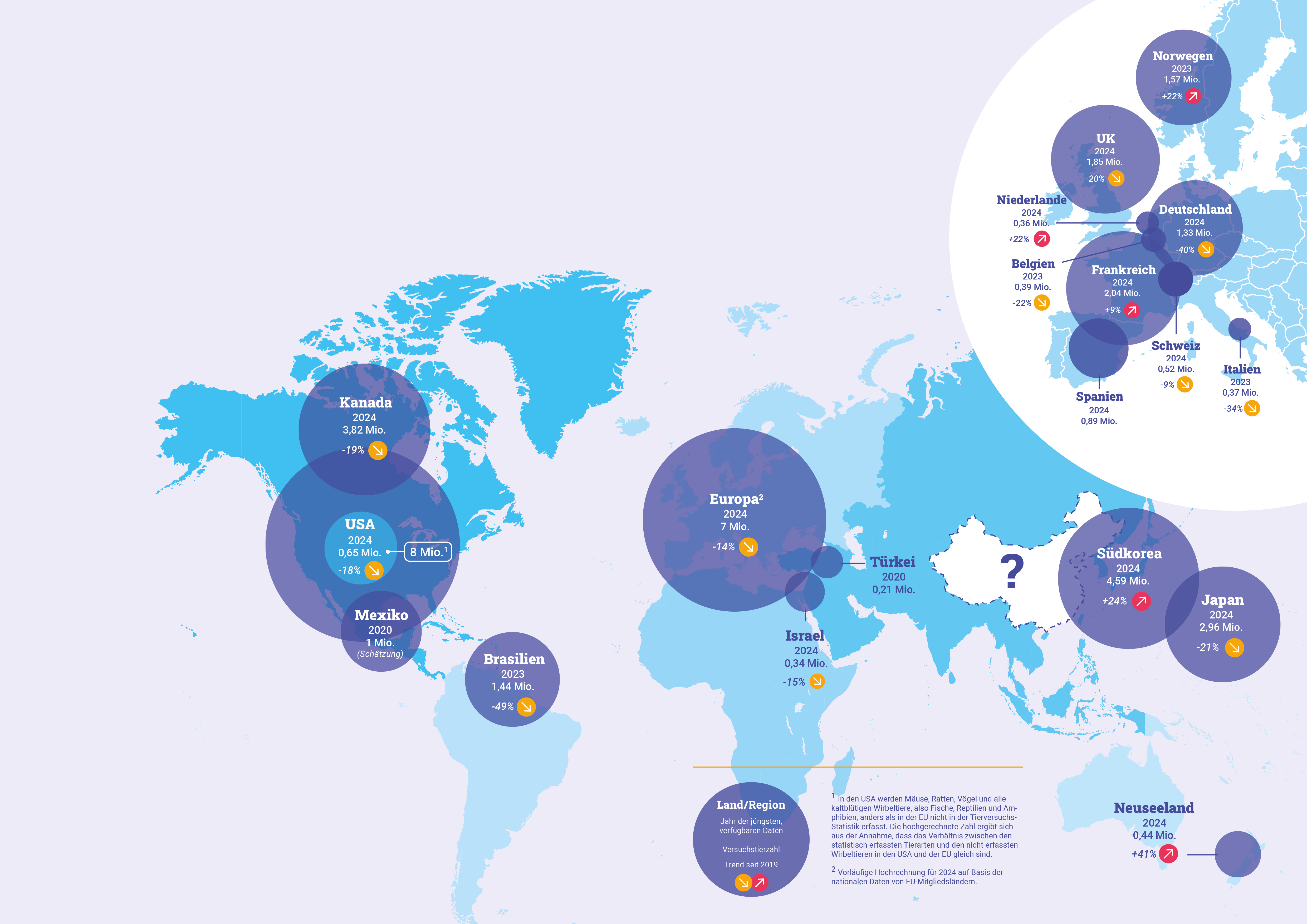 Zur Orientierung und Einordnung gehört auch der Blick über die Grenzen hinaus. Tierversuche sind kein nationales Thema, sondern Teil eines globalen Forschungs- und Wirtschaftsgefüges. Doch wie steht Deutschland im internationalen Vergleich da – und was können wir von anderen lernen? Der Kompass „Tierversuche 2026” wagt eine weltweite Bestandsaufnahme und zeigt, wie sich Deutschland zwischen hohen ethischen Ansprüchen und wachsender internationaler Konkurrenz behauptet. Ein globaler Trend sticht dabei heraus: Gesetzlich vorgeschriebene Tierversuche für regulatorische Zwecke gehen weiter zurück, neuerdings flankiert von politischen Roadmaps zur weiteren Reduktion. Diese Entwicklung erfordert ein Umdenken in der Diskussion über Tierversuche, nicht nur in Deutschland.