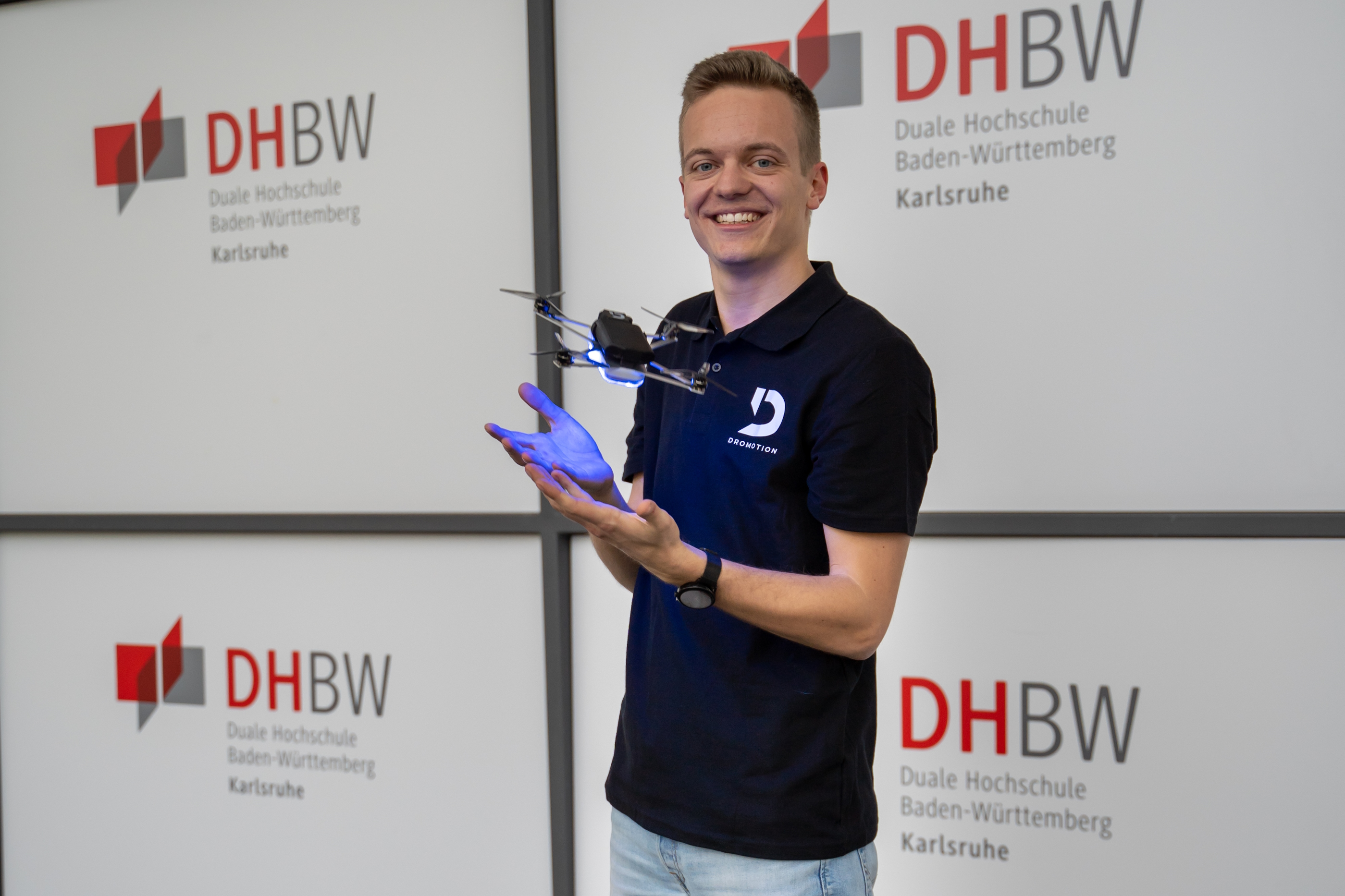 Wie viel Innovationskraft im Studiengang Elektro- und Informationstechnik der Dualen Hochschule Baden-Württemberg (DHBW) Karlsruhe steckt, zeigt ein Projekt aus dem Kurs “TEL23” auf eindrucksvolle Art und Weise: Der Student Jonas Kern, der sich aktuell im 6. Semester befindet, entwickelt eigene Drohnen-Lichtshows mit inzwischen rund 50 selbstgebauten Drohnen. Der Name seines Projektes: “Dromotion”.
