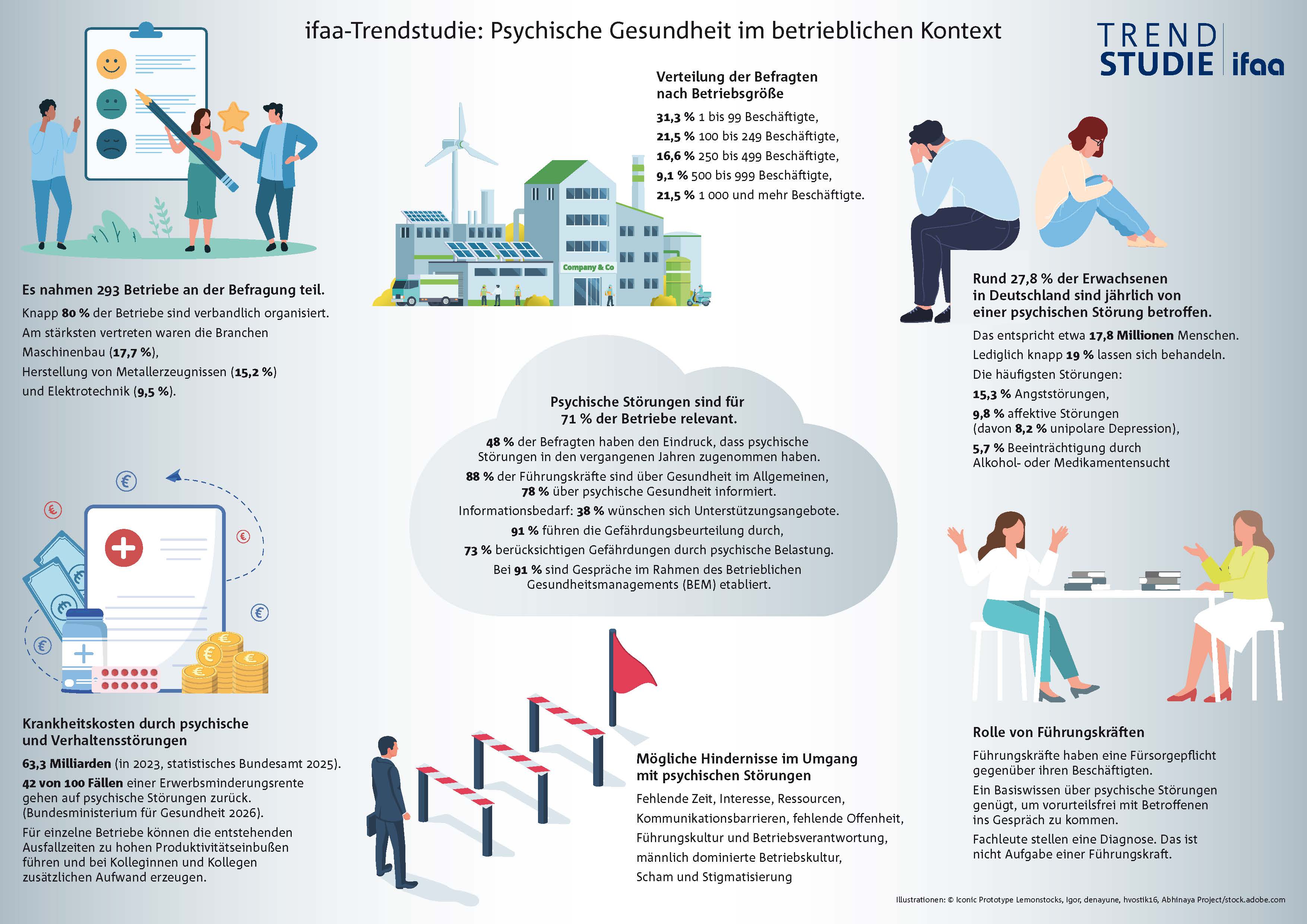 Das ifaa – Institut für angewandte Arbeitswissenschaft e. V. – legt neue Ergebnisse seiner Trendstudie zur psychischen Gesundheit im Betrieb vor. Die Studie zeigt: Während die große Mehrheit der Unternehmen gesetzliche Anforderungen im Arbeits- und Gesundheitsschutz erfüllt, wünschen sich viele Betriebe zusätzliche Unterstützung im Umgang mit psychischer Gesundheit. Insbesondere kleine und mittlere Unternehmen benötigen niedrigschwellige, praxisnahe Angebote. Die komplette Trendstudie ist hier abrufbar: www.arbeitswissenschaft.net/trendstudie-psychische-gesundheit