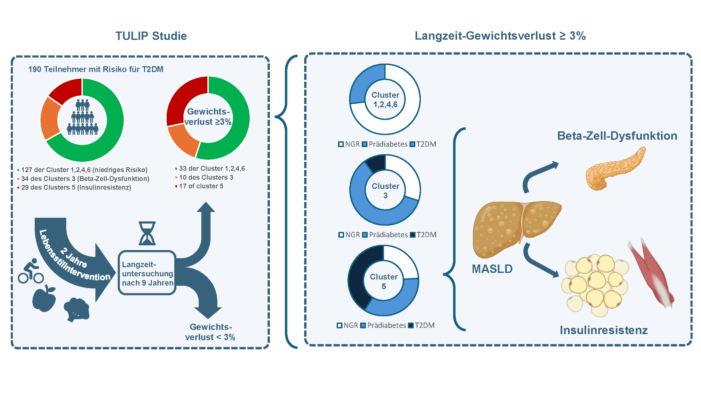 Grundlage der Studie waren Daten aus dem Tübinger Lebensstil-Interventionsprogramm (TULIP). Teilnehmende mit erhöhtem Typ 2 Diabetes Risiko absolvierten eine zweijährige Lebensstil-Intervention und wurden anschließend über einen Zeitraum von etwa neun Jahren nachbeobachtet. Im Fokus der Auswertung standen Personen, die ihr Körpergewicht langfristig deutlich reduzieren konnten.