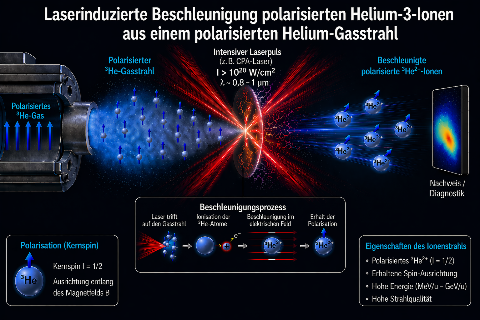Um nachzuweisen, ob die Polarisation bei den beschleunigten Teilchen erhalten bleibt, mussten die Forschenden erheblichen Aufwand treiben. Sie nutzen dazu ein spezielles Isotop des Edelgases Helium, das Helium-3. Zunächst erzeugten sie am Morgen jeden Messtages am Forschungszentrum Jülich ein vorpolarisiertes Helium-3-Gas, welches sie anschließend in einem Spezialbehälter zur GSI in Darmstadt transportierten. Am dortigen Hochleistungslaser PHELIX konnten sie die Laser-Plasma-Beschleunigung vornehmen. Mithilfe sogenannter CR-39-Platten, maßen die Physiker dann den Polarisationsgrad der beschleunigen Helium-3-Ionen.